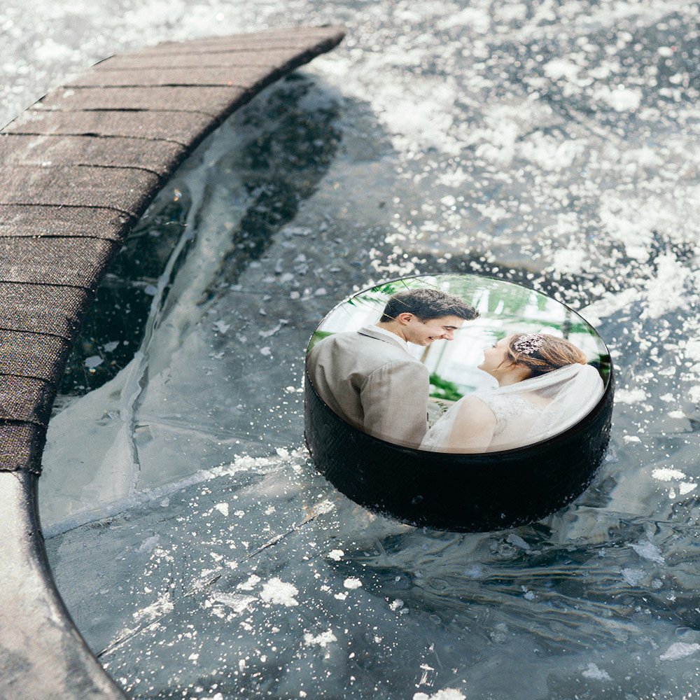 Customized pucks can include your precious wedding photo, and sentimental text, and lover's name! Makes a one-of-a-kind hockey puck for loved ones.