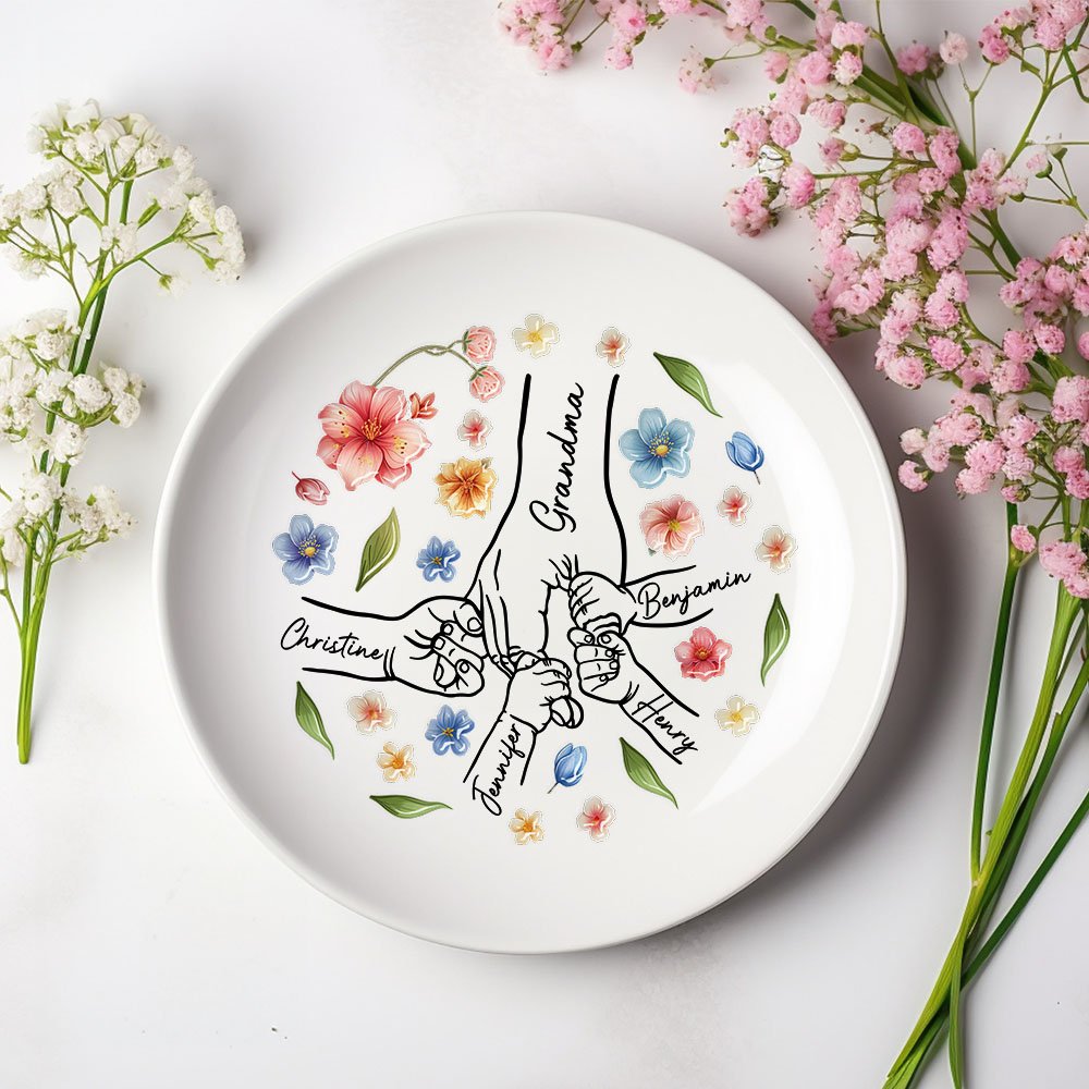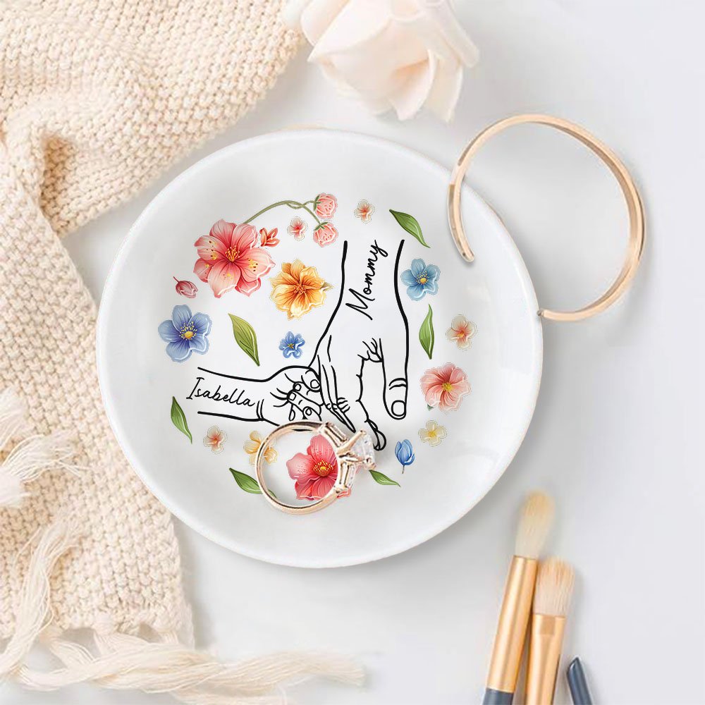 This jewellery dish, with its unique pattern of holding hands, symbolizes that we grow up under the care of our mothers or grandmothers. It can be Personalized with your mother's or grandmother's names and 1β9 kids' names. The design uses 3D image effects to bring beautiful flowers to life and make patterns more vivid.