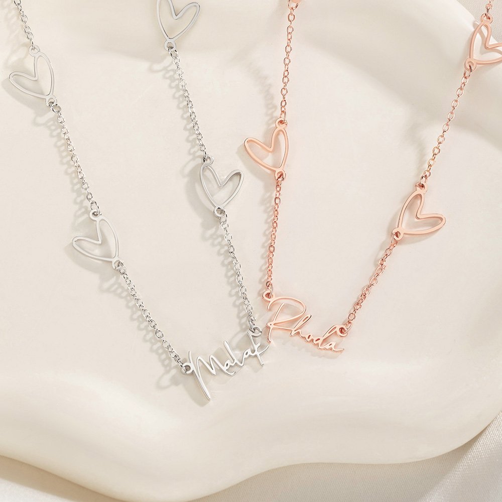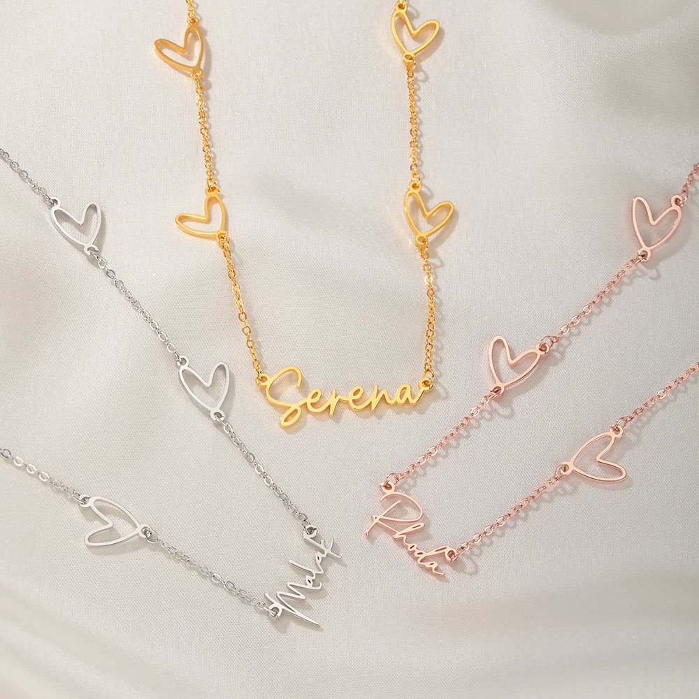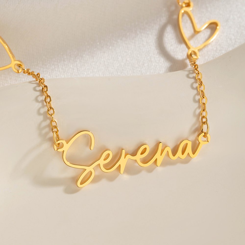 This necklace embodies the essence of love and exclusivity with a minimalist design. The chain is connected by multiple hollow hearts, and the pendant part is your name, presenting a unique exclusive logo. The overall design has soft lines, which are neither exaggerated nor exquisite, showing the wearer's unique temperament and taste.