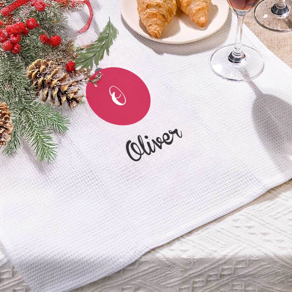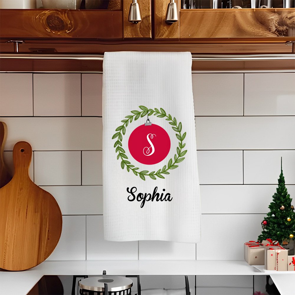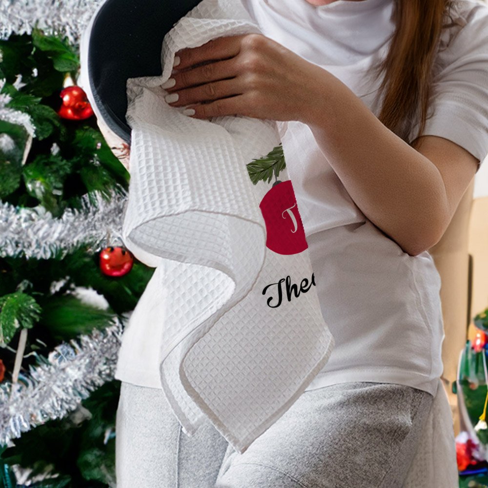 This towel features a holly wreath with a Christmas ball, symbolizing the holiday season's spirit and joy. The red berries contain white initials, so you can add your name to the towel to create a unique souvenir.