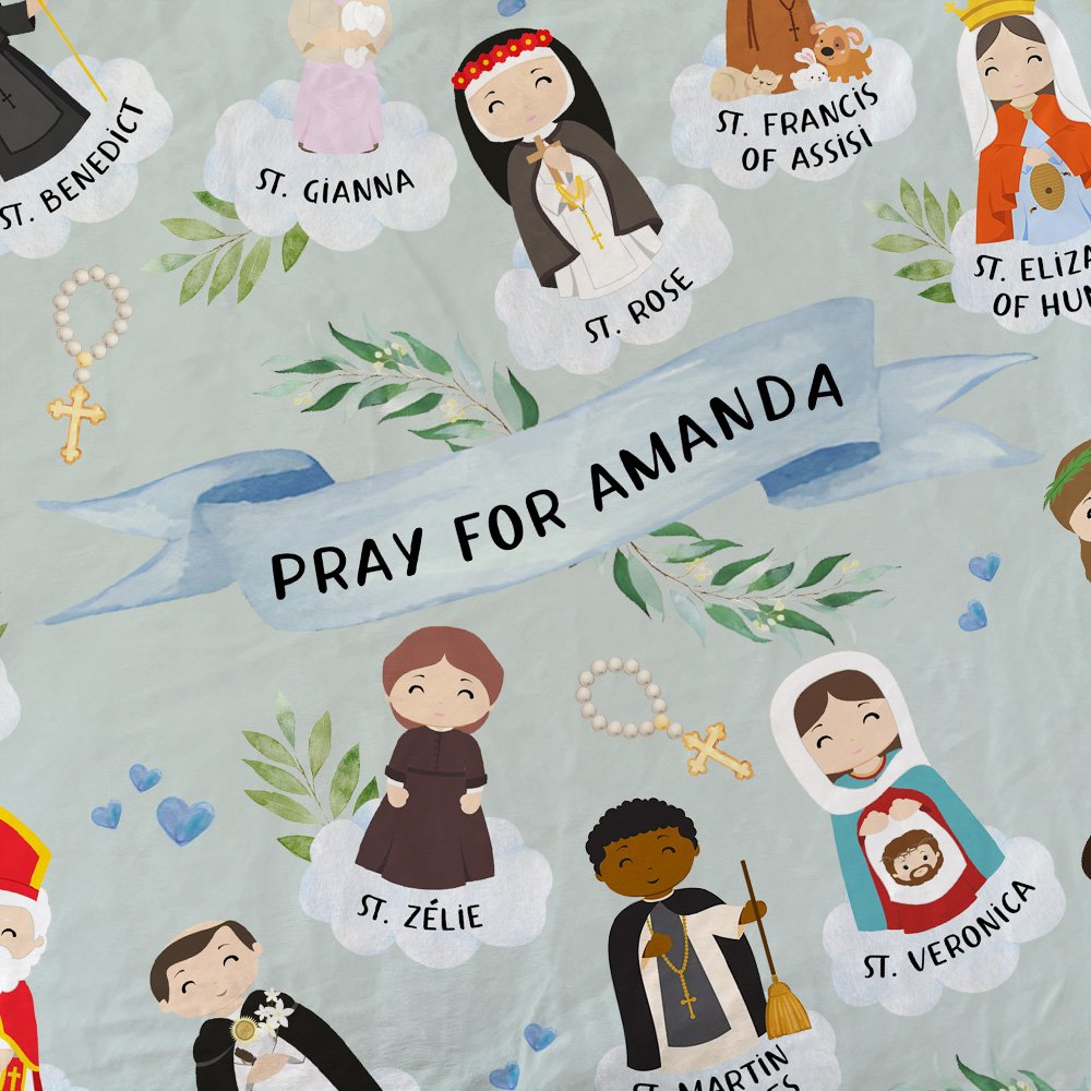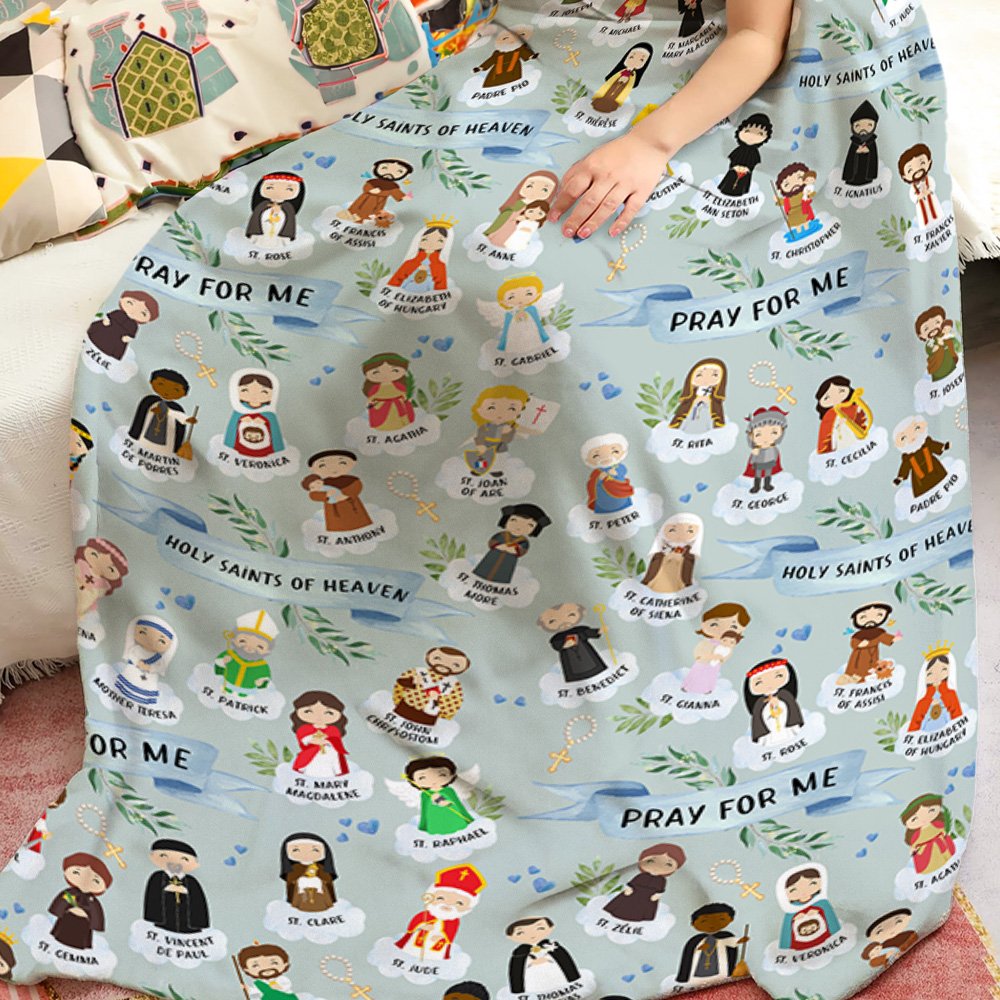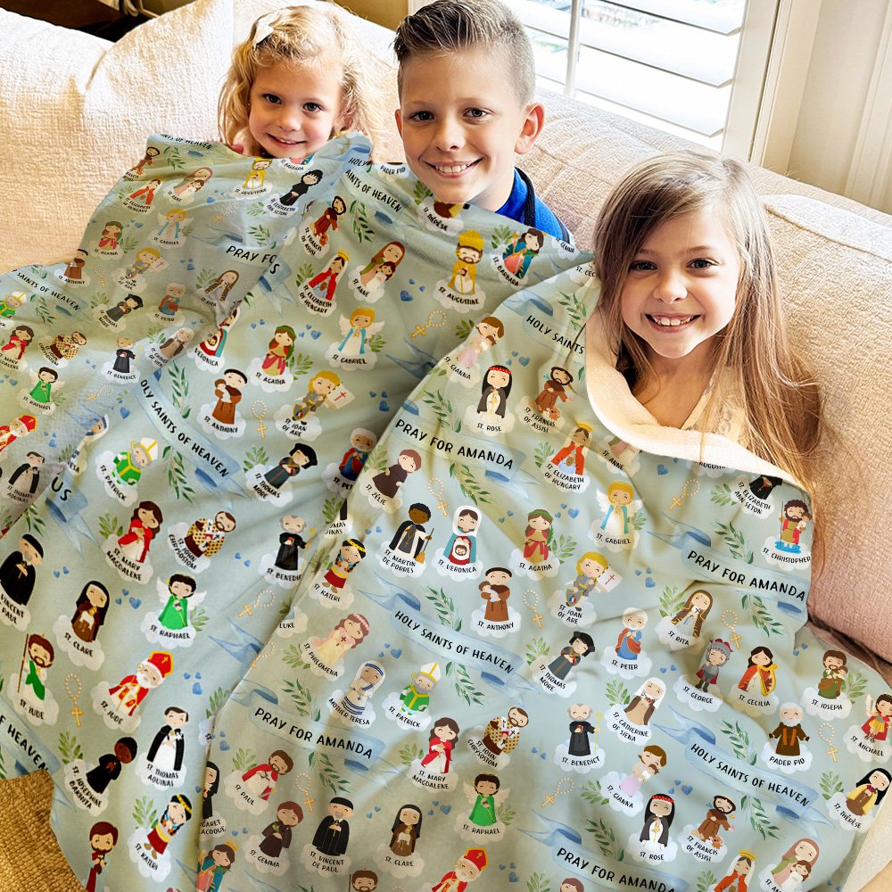 More than just a blanket, this Heavenly Saints Blanket features images of Catholic saints from Heaven. It's a comfort from Heaven. Beautifully designed with images of several Catholic saints and customizable names, the blanket adds a touch of spirituality to any room.