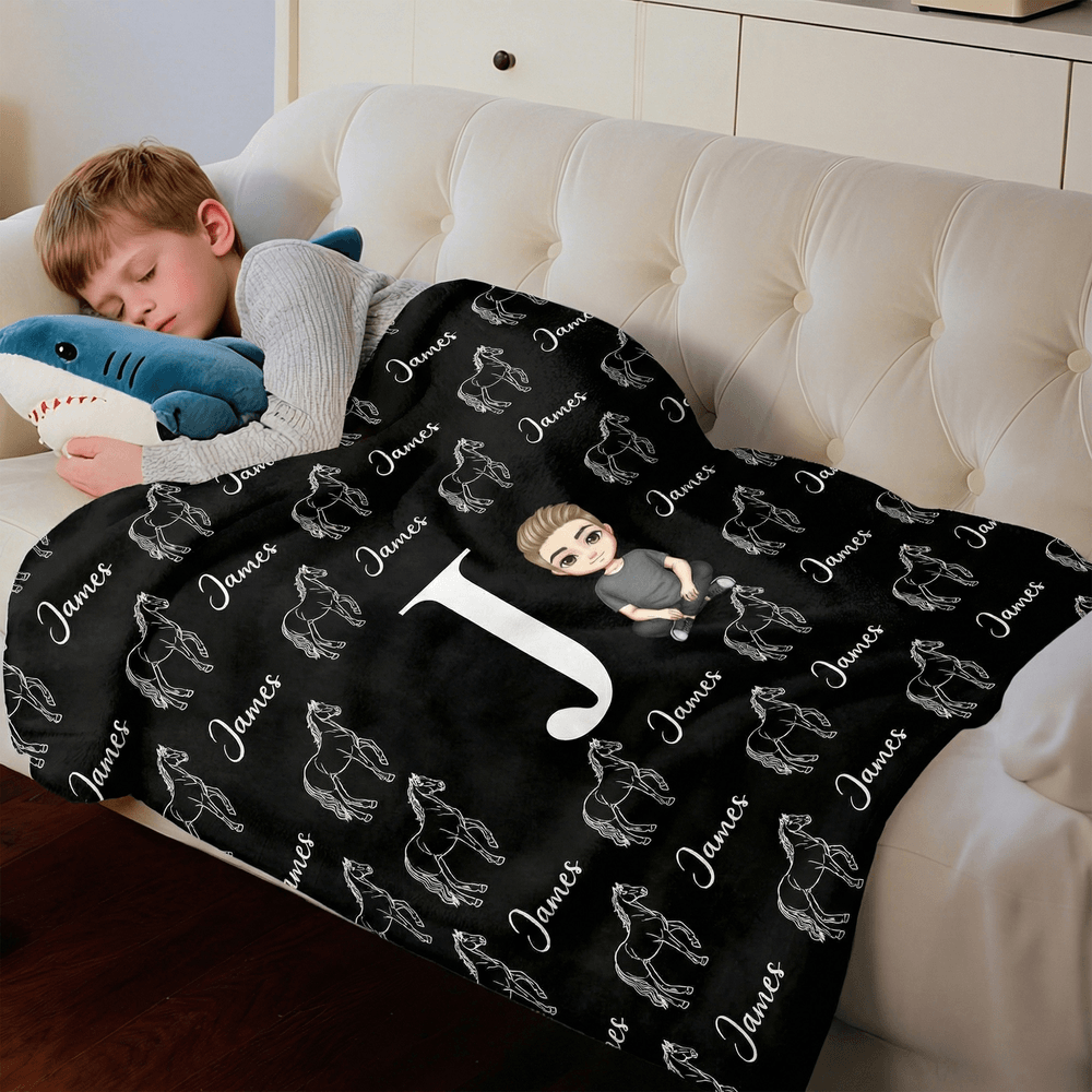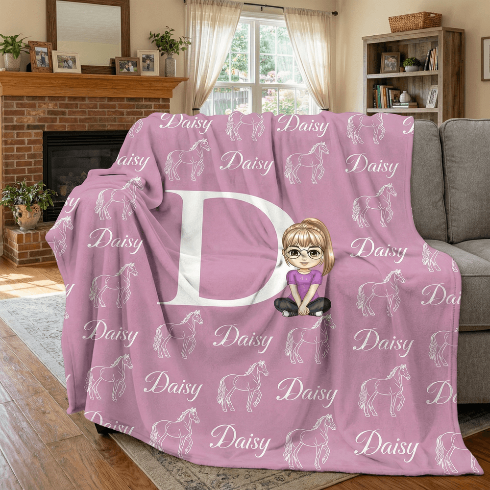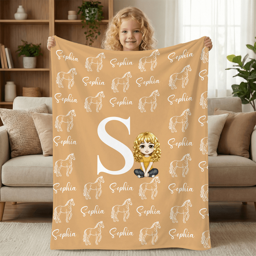 This cozy blanket features a repeating pattern of horse silhouettes, paired with a large, bold initial and a cute custom cartoon portrait of the recipient. It offers full personalization: add the name in a clean, stylish font across the blanket, creating a one-of-a-kind piece that celebrates the love for horses. The warm, neutral colour palette complements any decor, blending charm with a personal touch.
