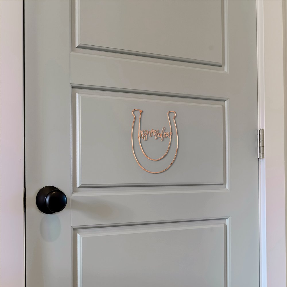Our horseshoe door sign features a unique and eye-catching element—a hand-wound wire name in the centre. The wire is expertly shaped to spell out the name of recipient, adding a personality and making it a special gift for anniversaries or horse lovers.