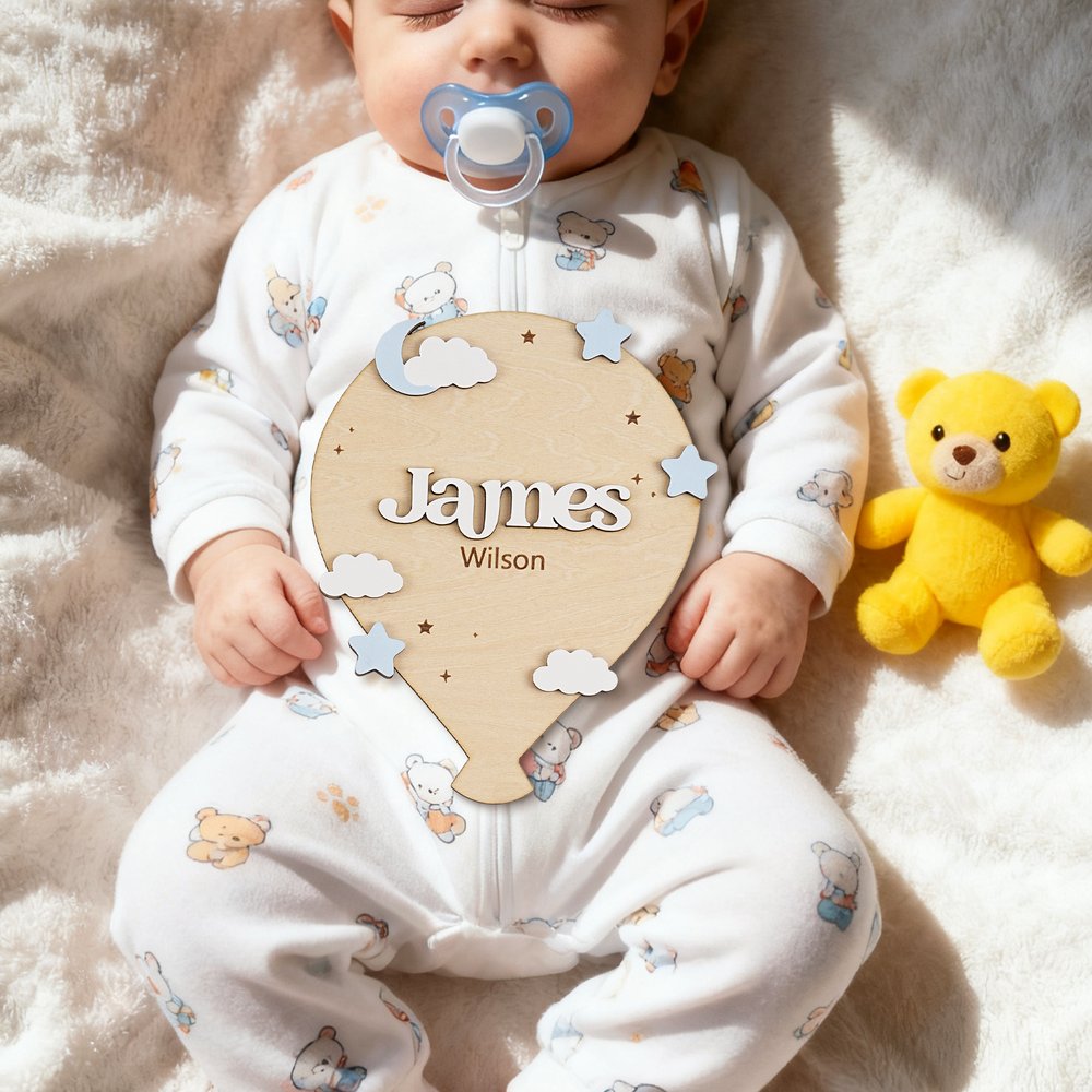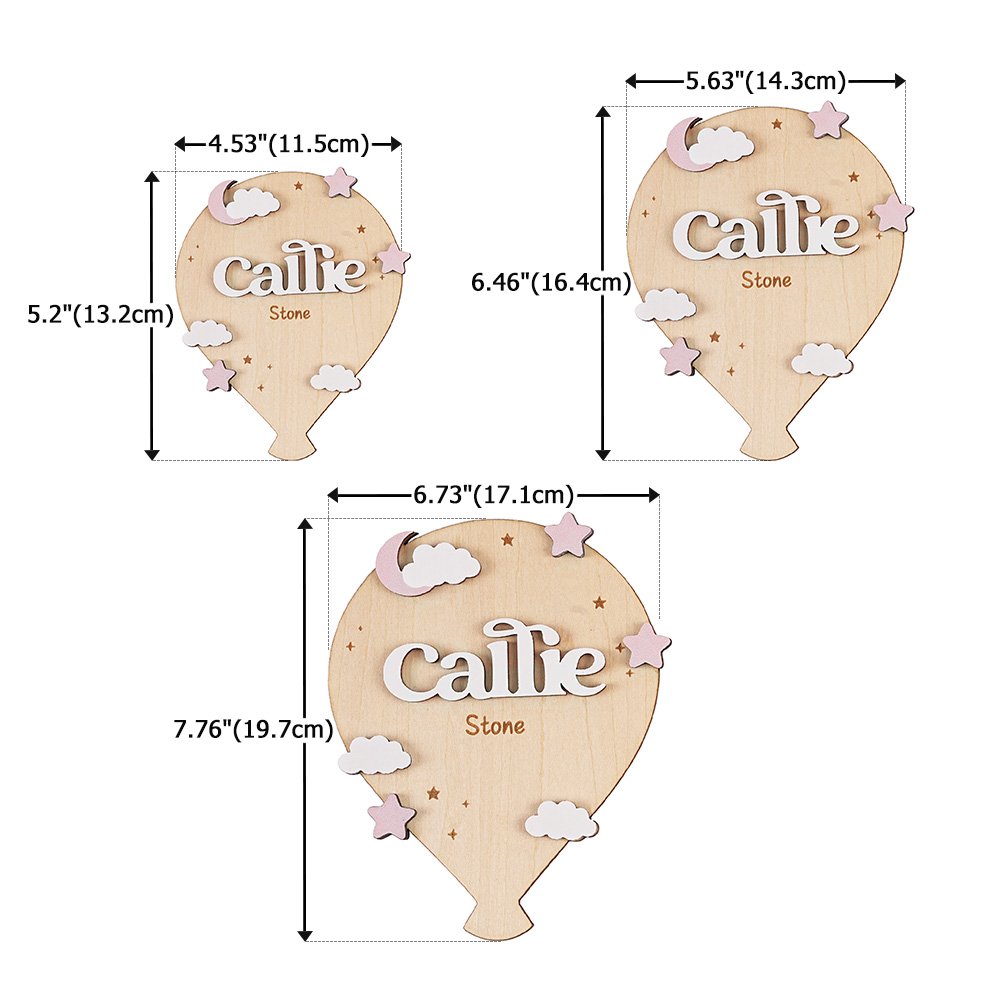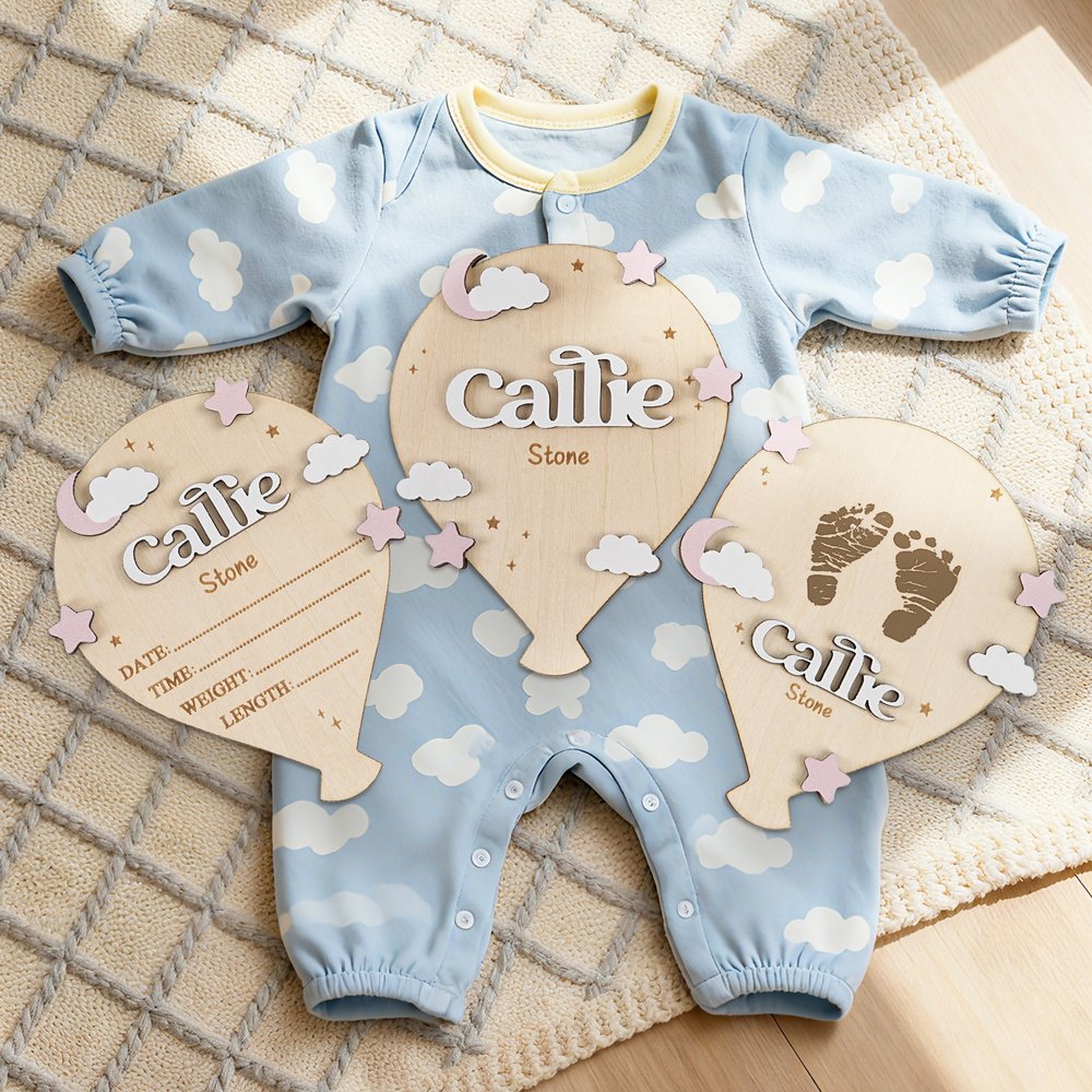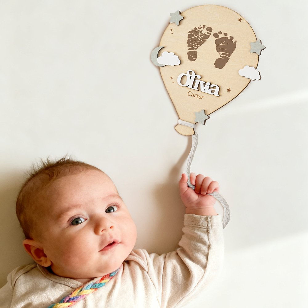 This baby birth announcement sign features a hot air balloon design, cleverly incorporating elements of clouds and stars for a fairytale-like visual experience. The main part of the hot air balloon can be customized with the baby's name. You can also add footprints and birth information to express your love and expectations for the newborn.