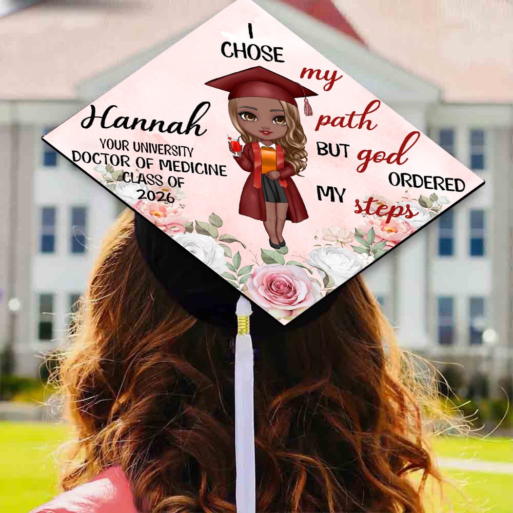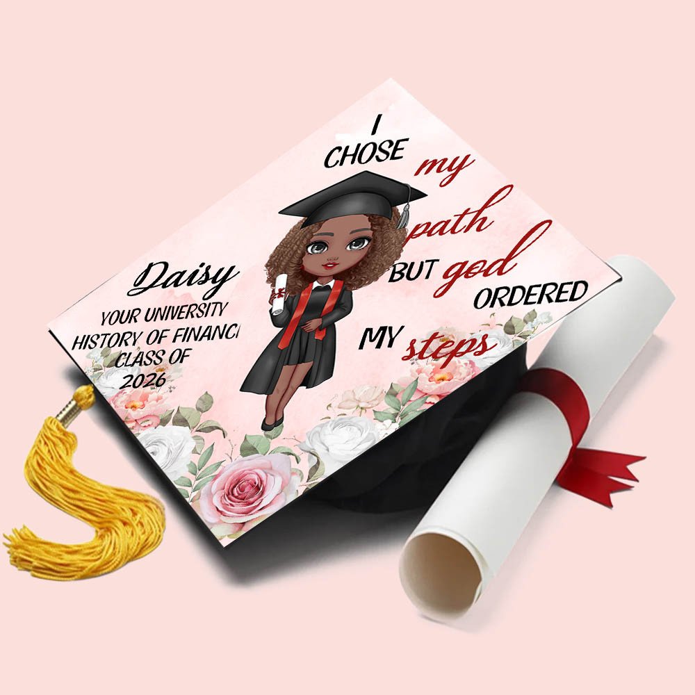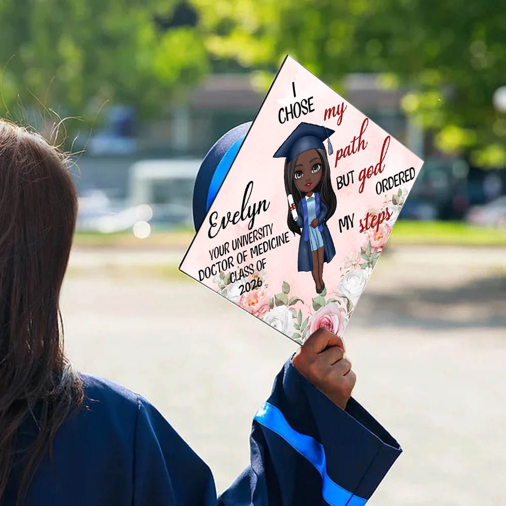 Our “I Chose My Path But God Ordered My Steps” topper is your perfect graduation cap choice. Personalize your cap topper with your name, school, degree, and graduation year, along with a charming cartoon graduate image. This customization ensures that your topper is a true reflection of your individual journey and accomplishments.