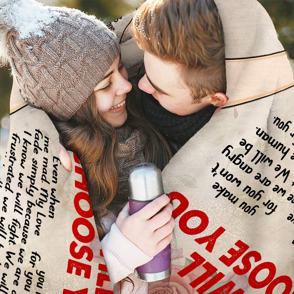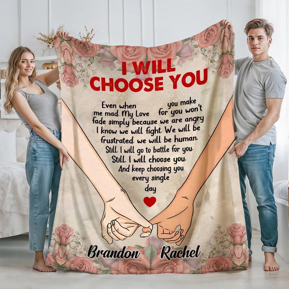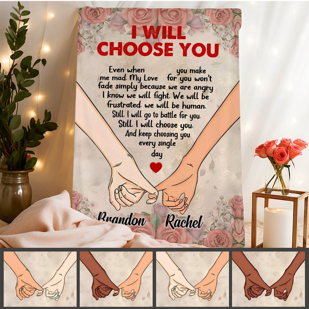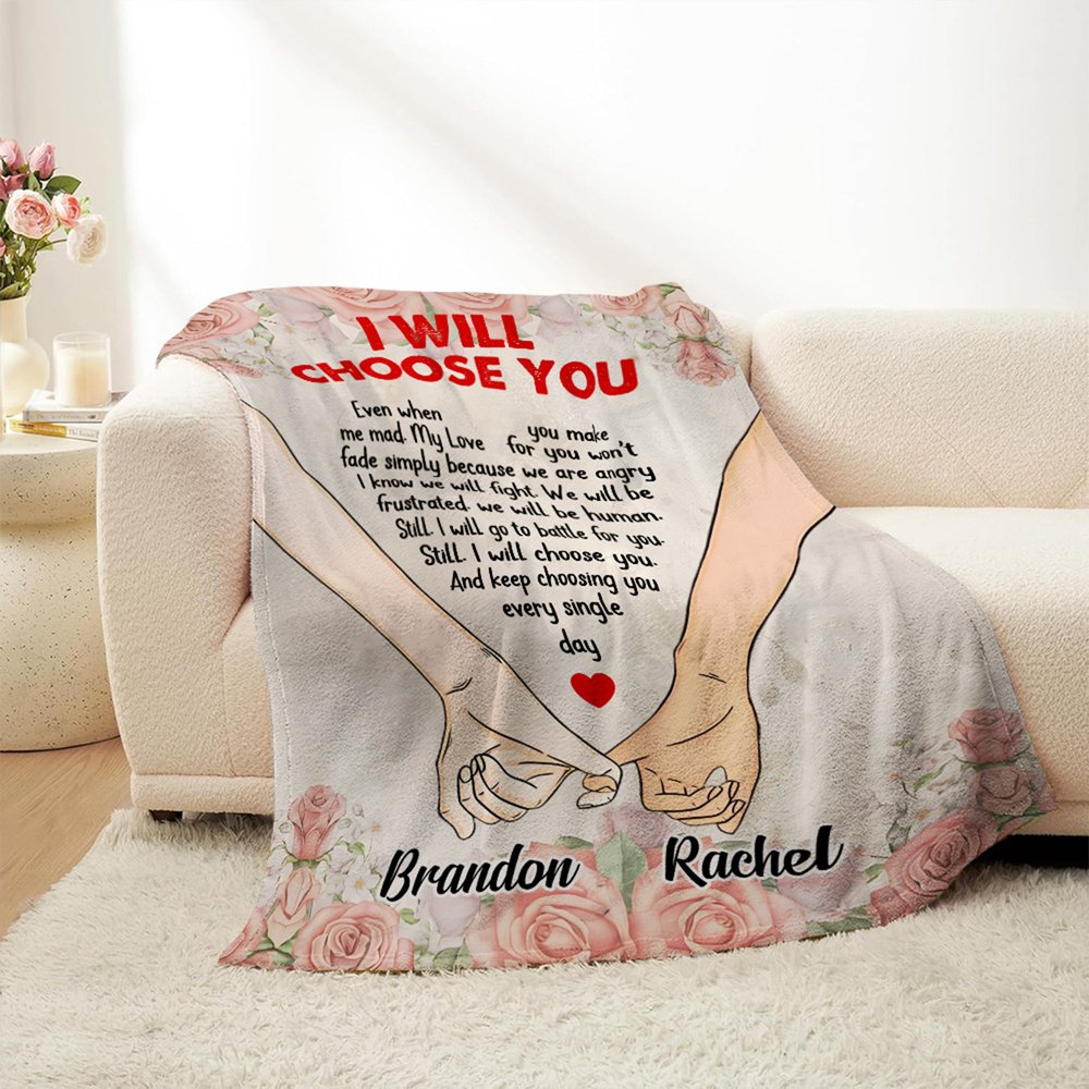 This blanket features the heartfelt phrase "I Will Choose You" at its core, accompanied by elegant hand-holding graphics and romantic rose decorations. The design thoughtfully captures the emotional connection between couples, making it more than just an ordinary blanket; it becomes a profound symbol of love. We also offer various skin tone options and name customization, ensuring that each piece is uniquely yours and tailored for you and your partner.