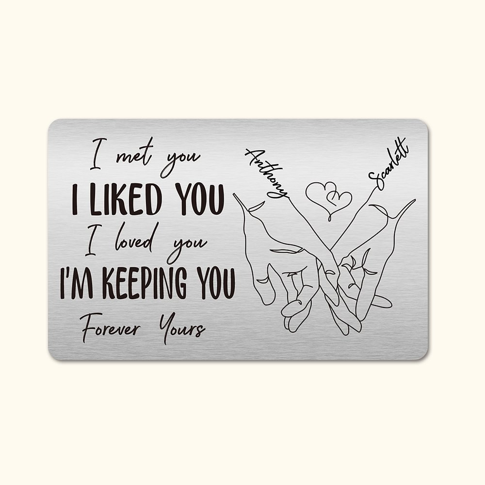 It is a very memorable gift, especially suitable for special memories between couples. The card design is simple and elegant, printed with affectionate words and hand-painted style couple holding hands, conveying deep love and commitment to each other, and the touching words printed on the card: "I met you. I liked you. I loved you. I'm keeping you. Forever Yours." expresses the deep affection and commitment to the other half. Users can customize the couple's name on the card to make it more unique and memorable.