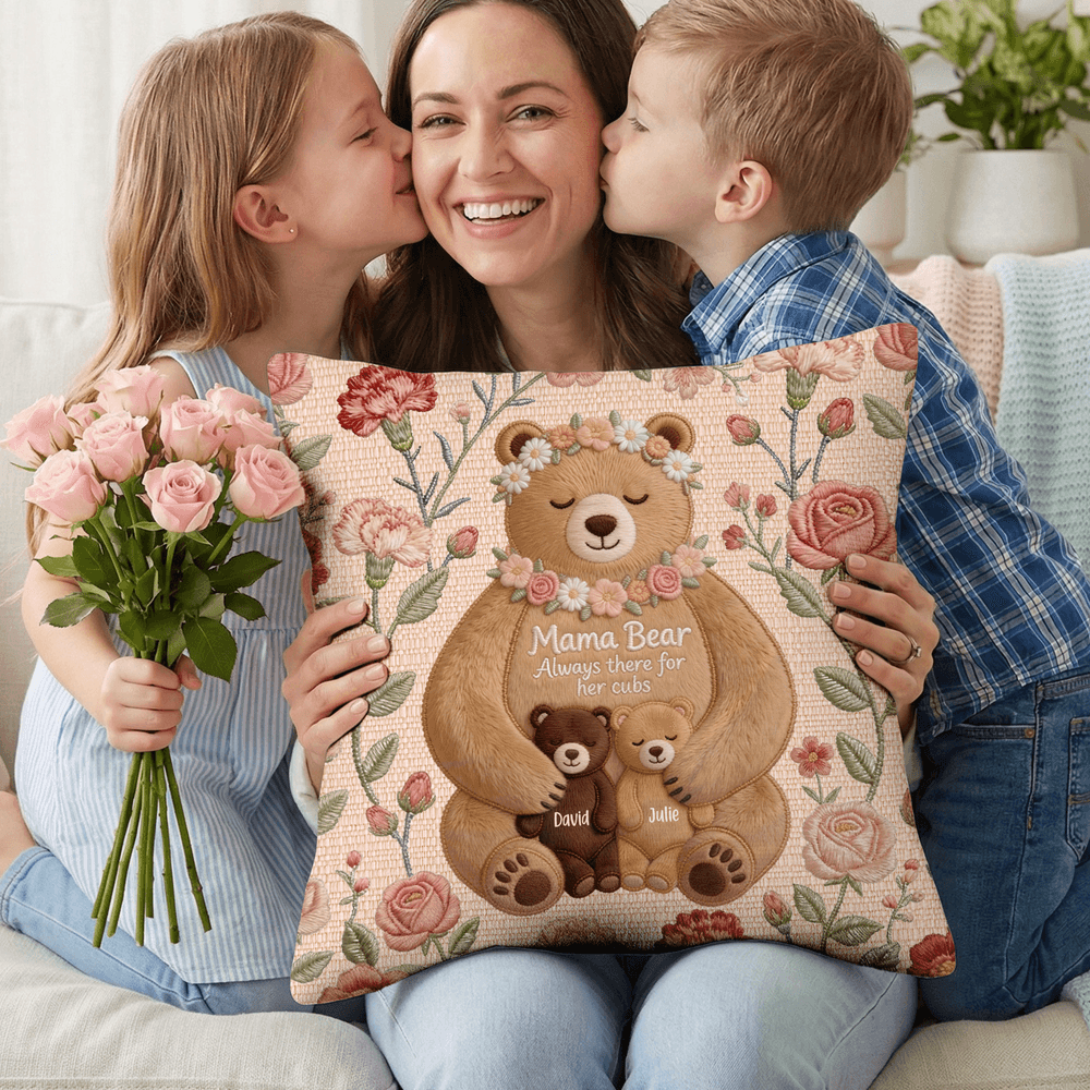 Personalized Imitation Embroidery Effect Flower Cute Mom-Baby Bear Soft Throw Pillow Cover with Names Room Decor Mother's Day Gift for Mom