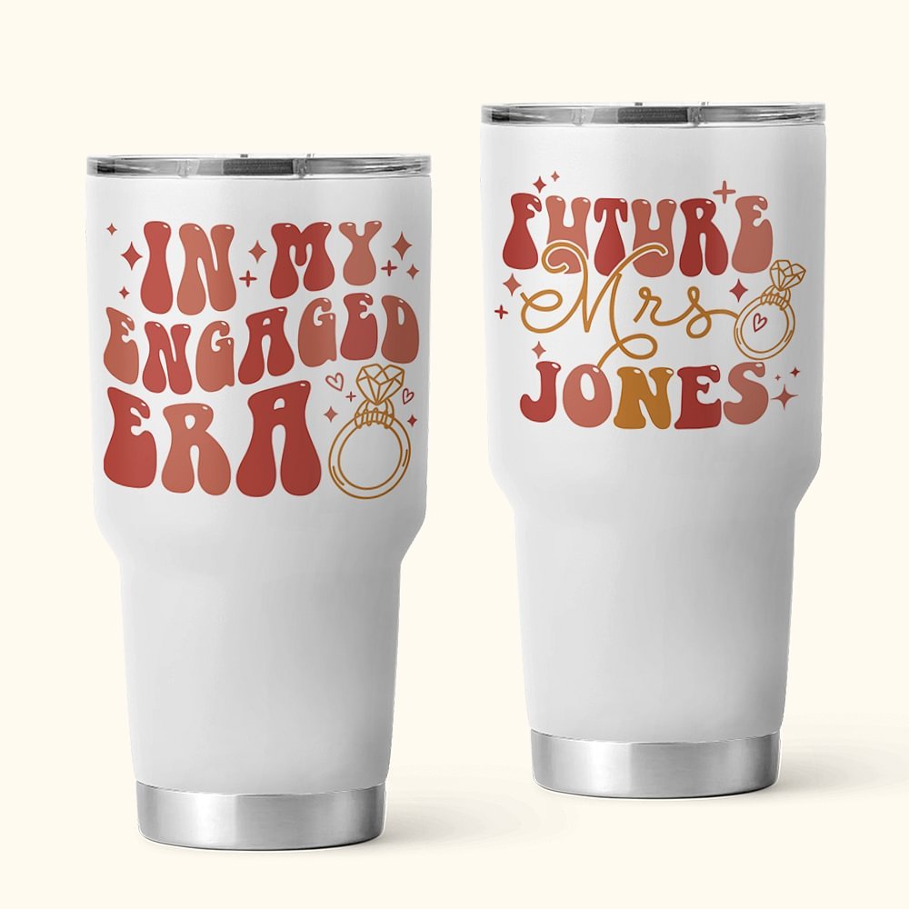 The words "IN MY ENGAGED ERA FUTURE" on the tumbler add excitement and joy, capturing the essence of this beautiful stage. Whether used at home, at work, or during wedding planning, this tumbler will become an everyday reminder of the upcoming wedding and its happiness.