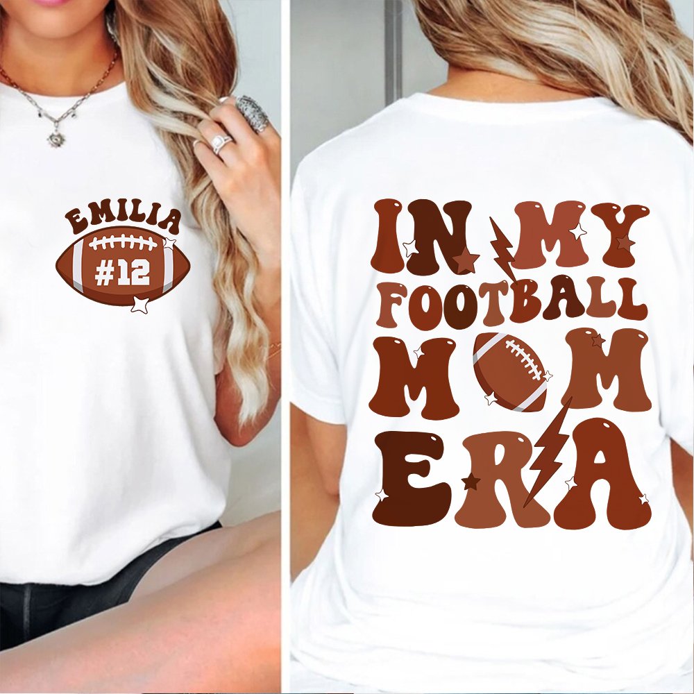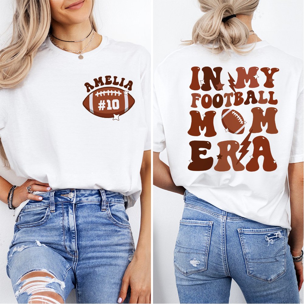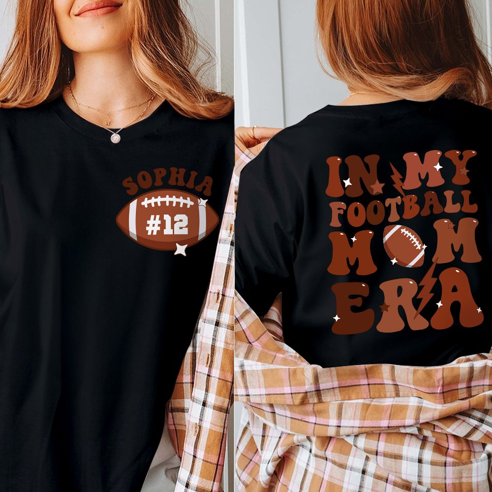 This mom t-shirt features a stylish football pattern on the front, and the phrase "In My Football Mom Era" is elegantly printed on the back. Plus, the left chest area can be Personalized with your mom's name and number, adding a heartfelt touch to this unique garment. Gift it to your mom and let her feel the warmth and love every time she wears it.