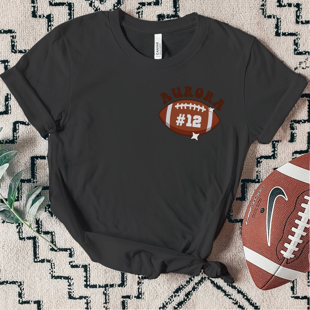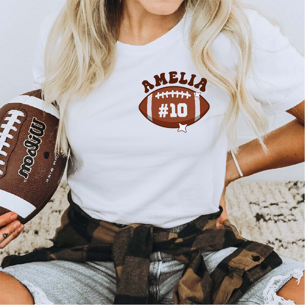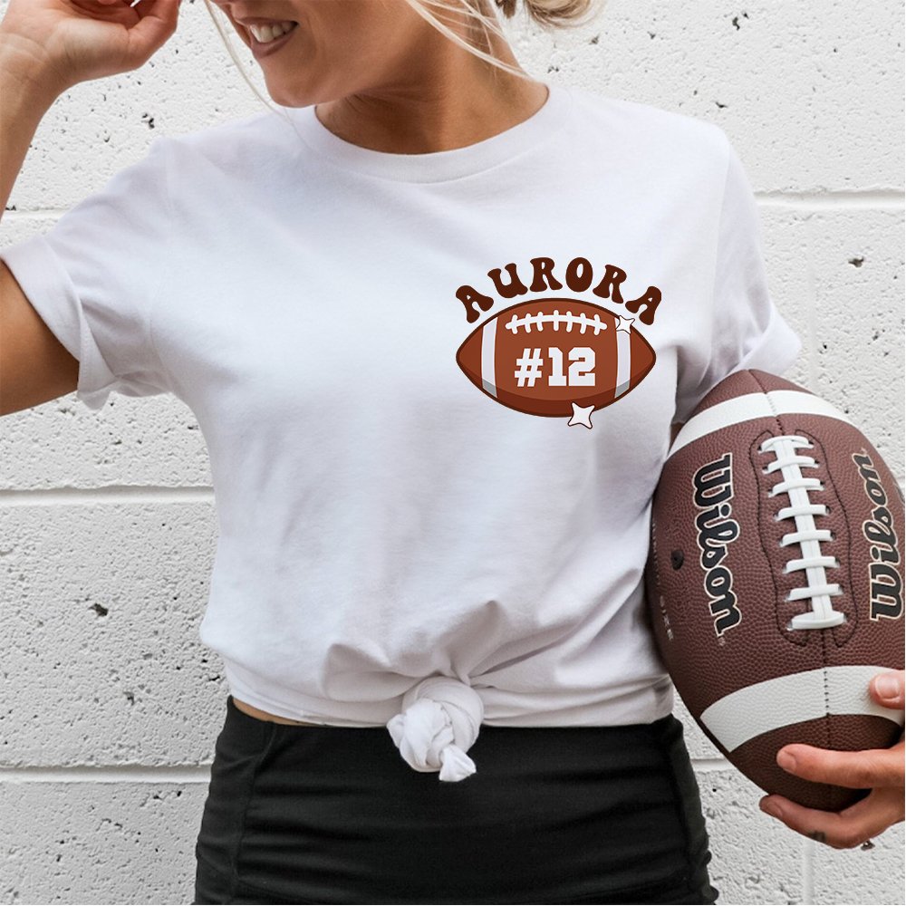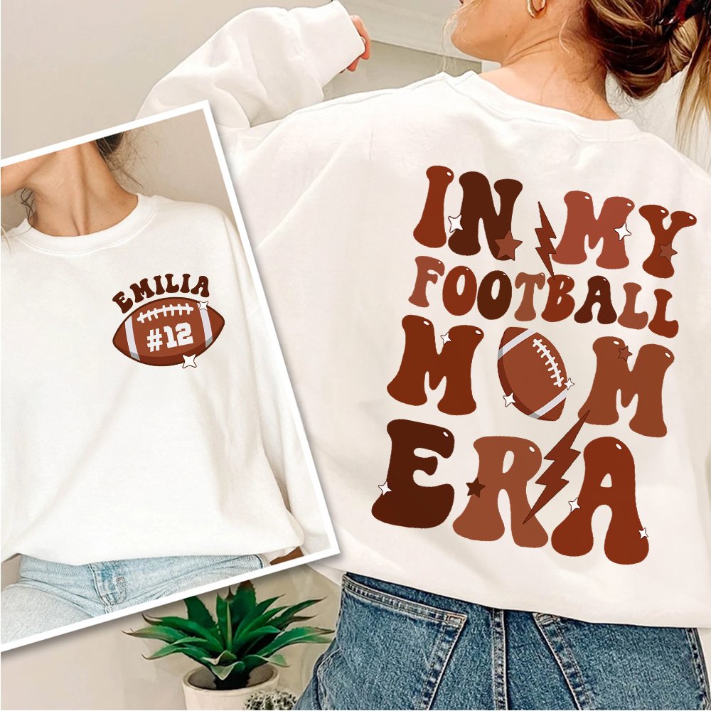This mom t-shirt features a stylish football pattern on the front, and the phrase "In My Football Mom Era" is elegantly printed on the back. Plus, the left chest area can be Personalized with your mom's name and number, adding a heartfelt touch to this unique garment. Gift it to your mom and let her feel the warmth and love every time she wears it.