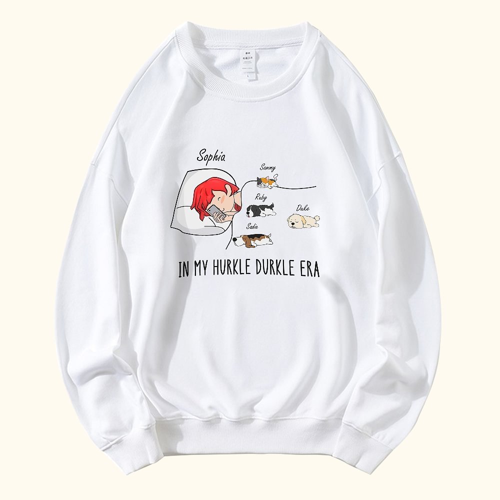 Featuring an adorable text, "In My Hurkle Durkle Era" and a girl surrounded by one to five pet illustrations, this sweatshirt exudes charm and playfulness. The colorful and vibrant design adds joy to her wardrobe, making it a perfect choice for casual outings or lounging at home.