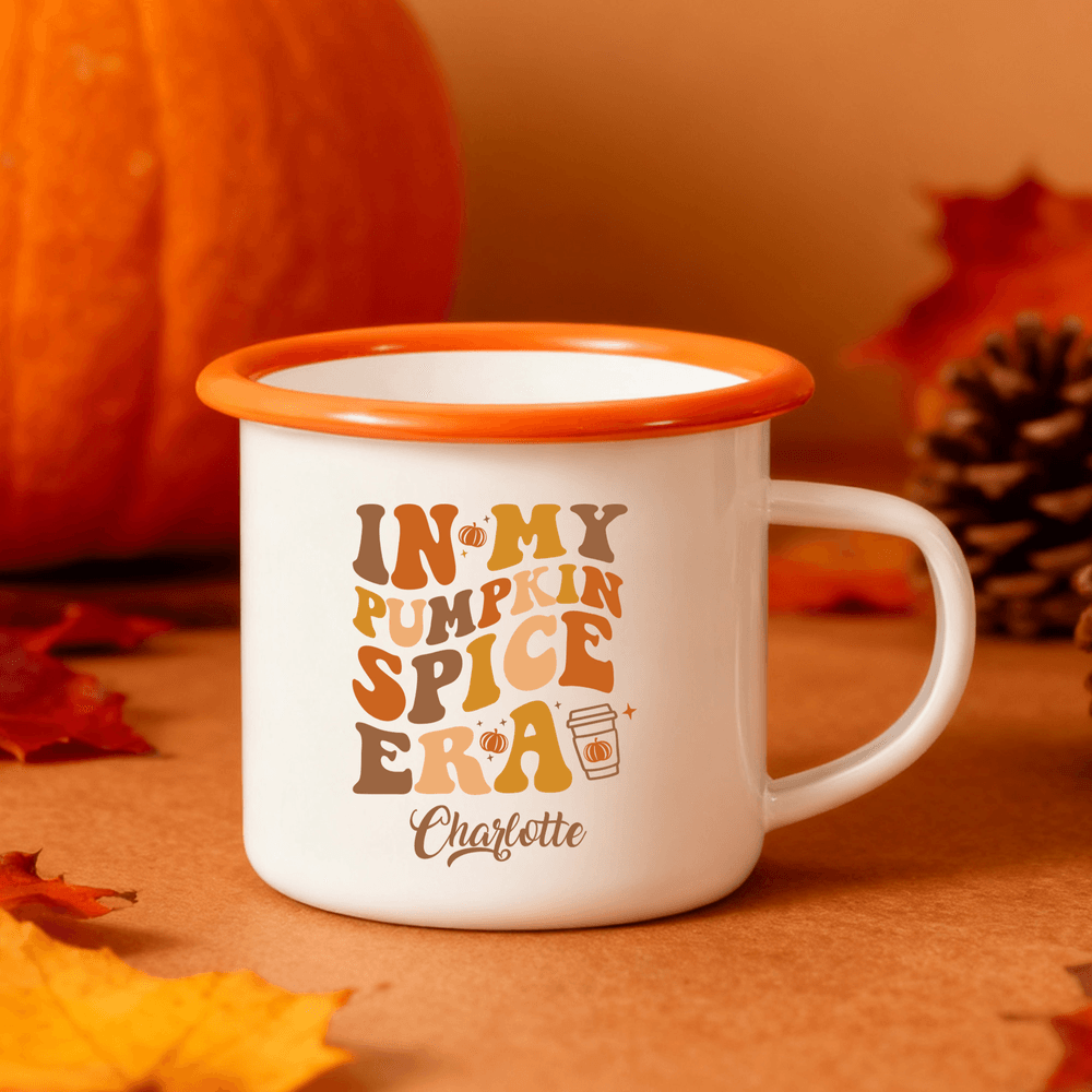 Embossed with the words "IN MY PUMPKIN SPICE ERA," this enamel mug, paired with rich Thanksgiving elements, perfectly captures the festive atmosphere. Customizable with your name and a variety of colours, each enamel mug is a one-of-a-kind, personalized piece.