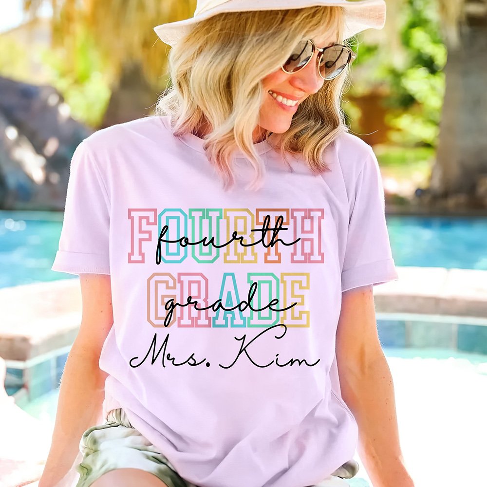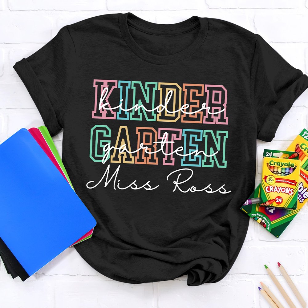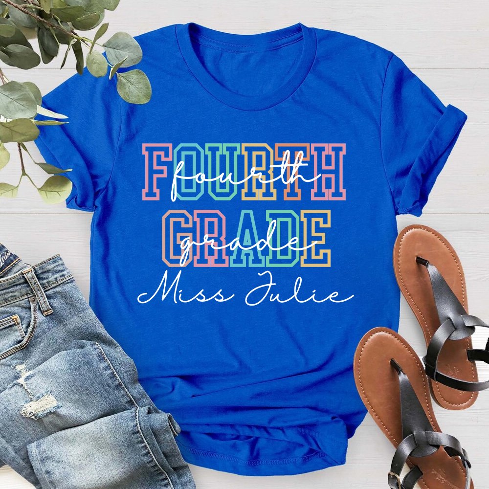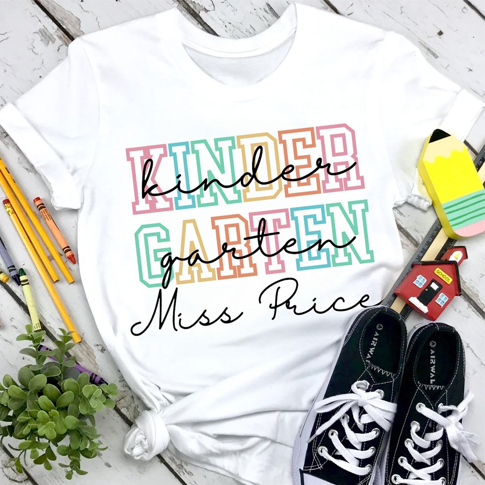 This t-shirt is for teachers teaching grades kindergarten through sixth grade and features an uplifting print of the teacher's name! Bursting with optimism and vitality, its colourful alphabets aligned in artistic font designs create a creative and Personalized visual effect, showing off an energetic and distinctive style.