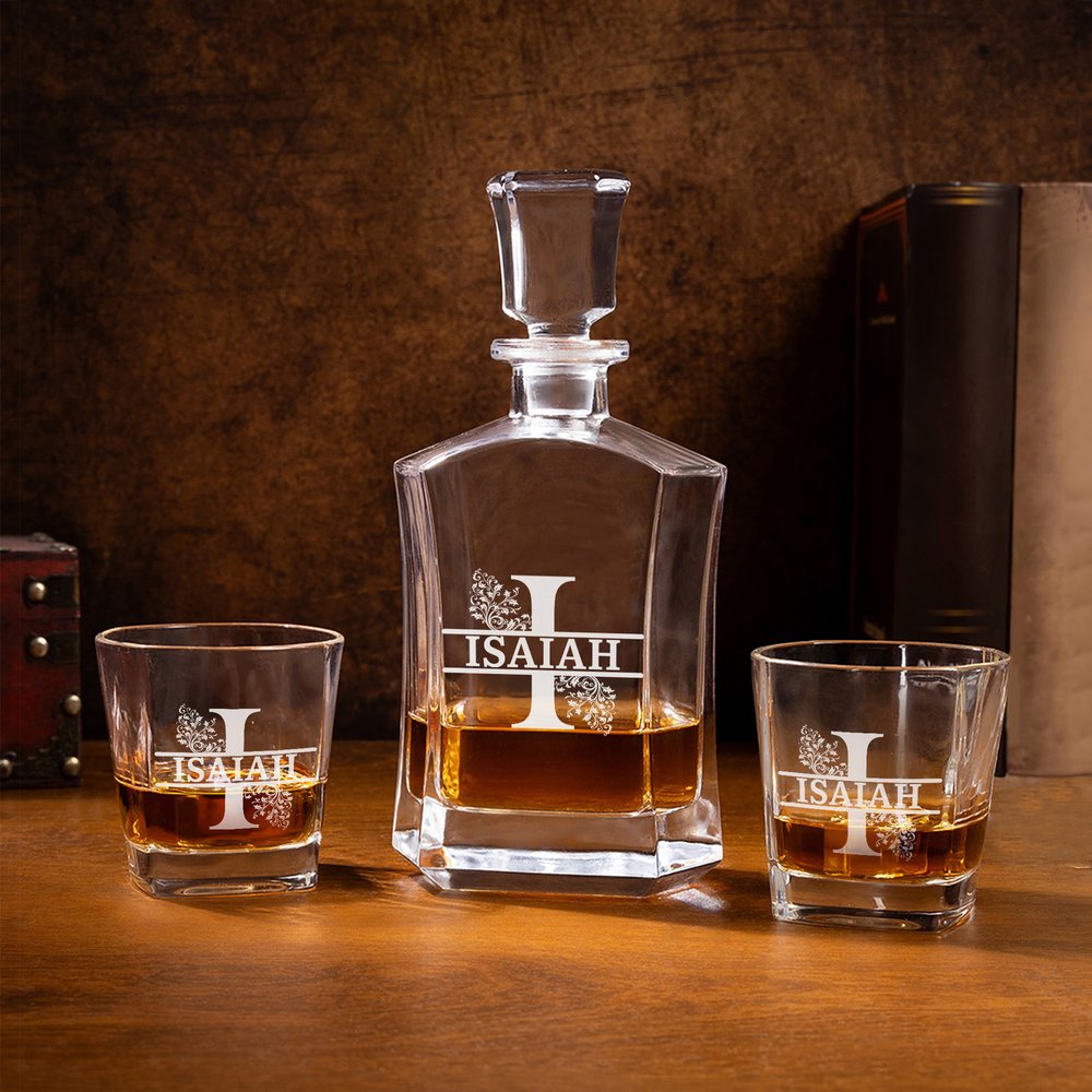 The decanter features a sleek hexagonal silhouette made of clear, glossy soda-lime glass. Its front surface displays a laser-engraved initial paired with a delicate wreath pattern, lending a classic, sophisticated vibe. The style is refined yet approachable—ideal for elevating any whisky-drinking experience.