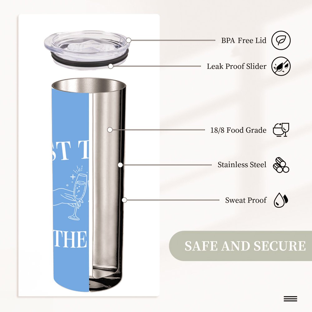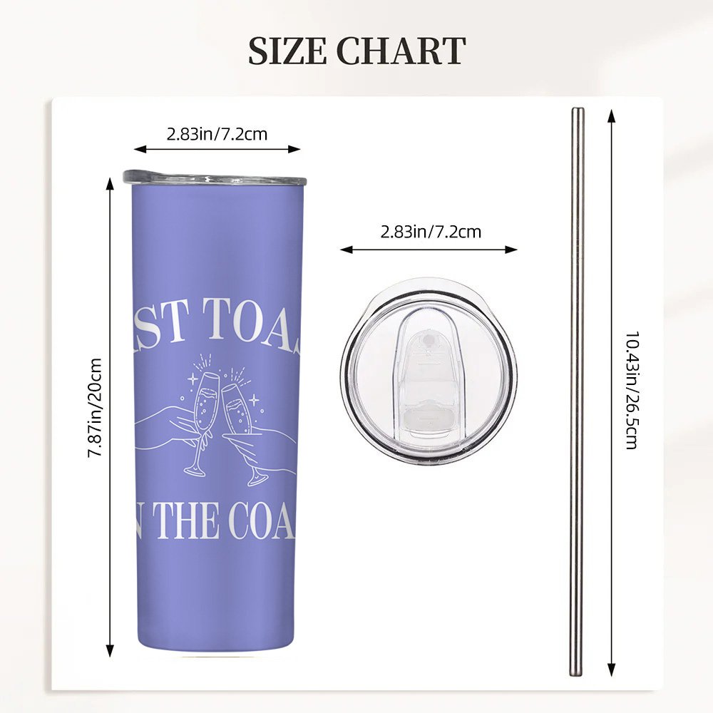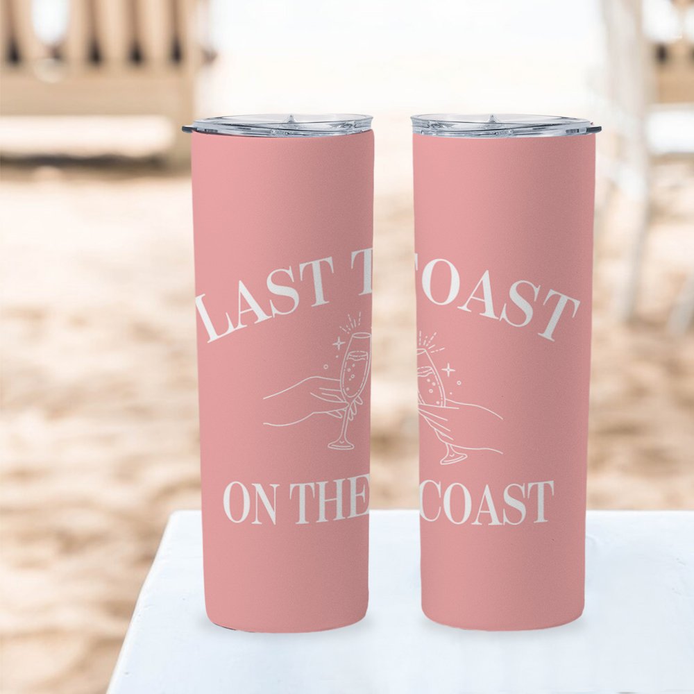 Our tumbler is truly unique because the Personalized option of adding your name makes it unique. The Text "Last Toast On The Coast" and the cheers pattern add a playful and cheerful atmosphere to any celebration.