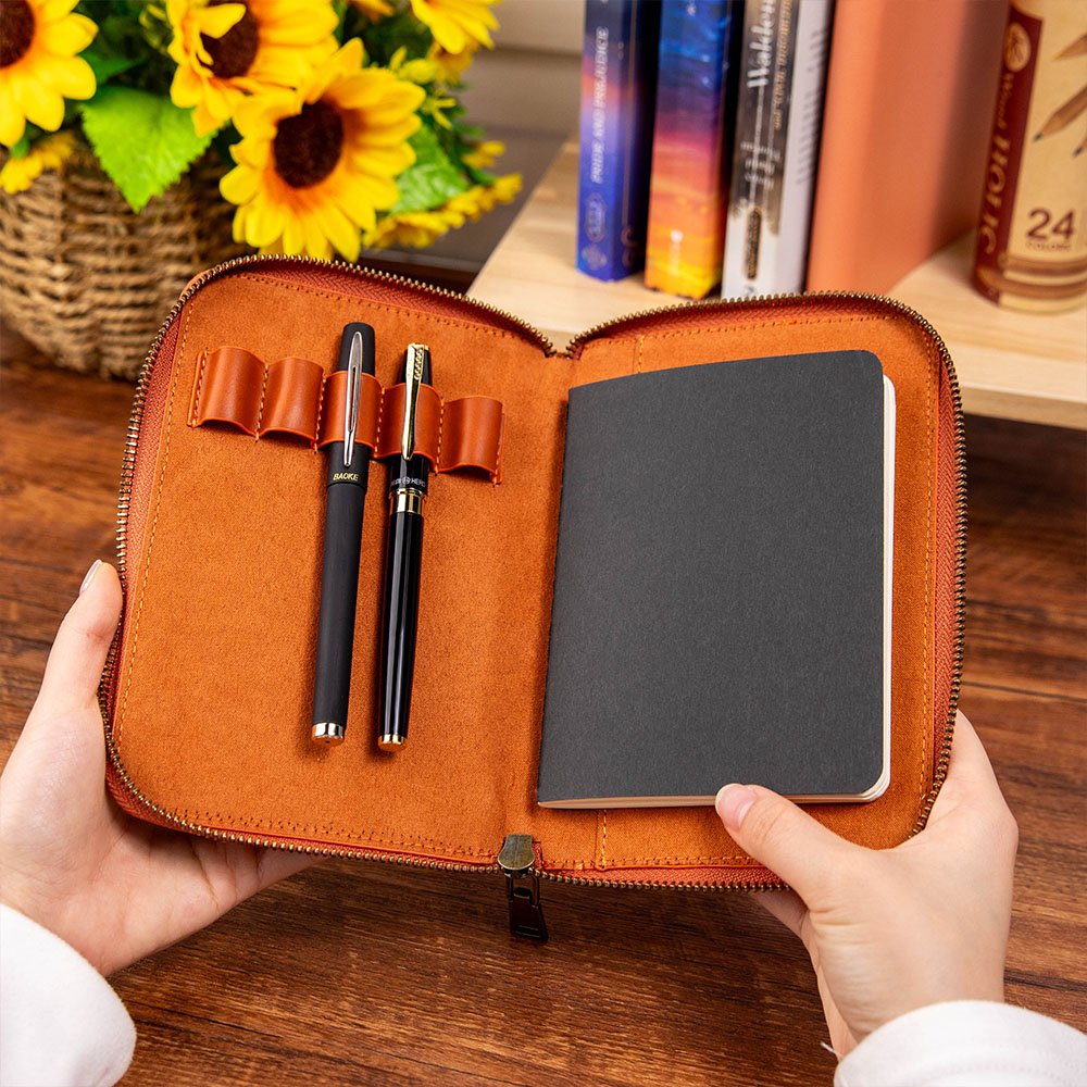 The storage bag features a sturdy zipper closure and internal loops to secure pens, which can securely hold notebooks and pens inside to prevent them from slipping or being damaged during travel. Smooth zipper operation ensures easy access and effortless use.