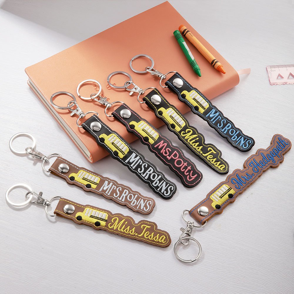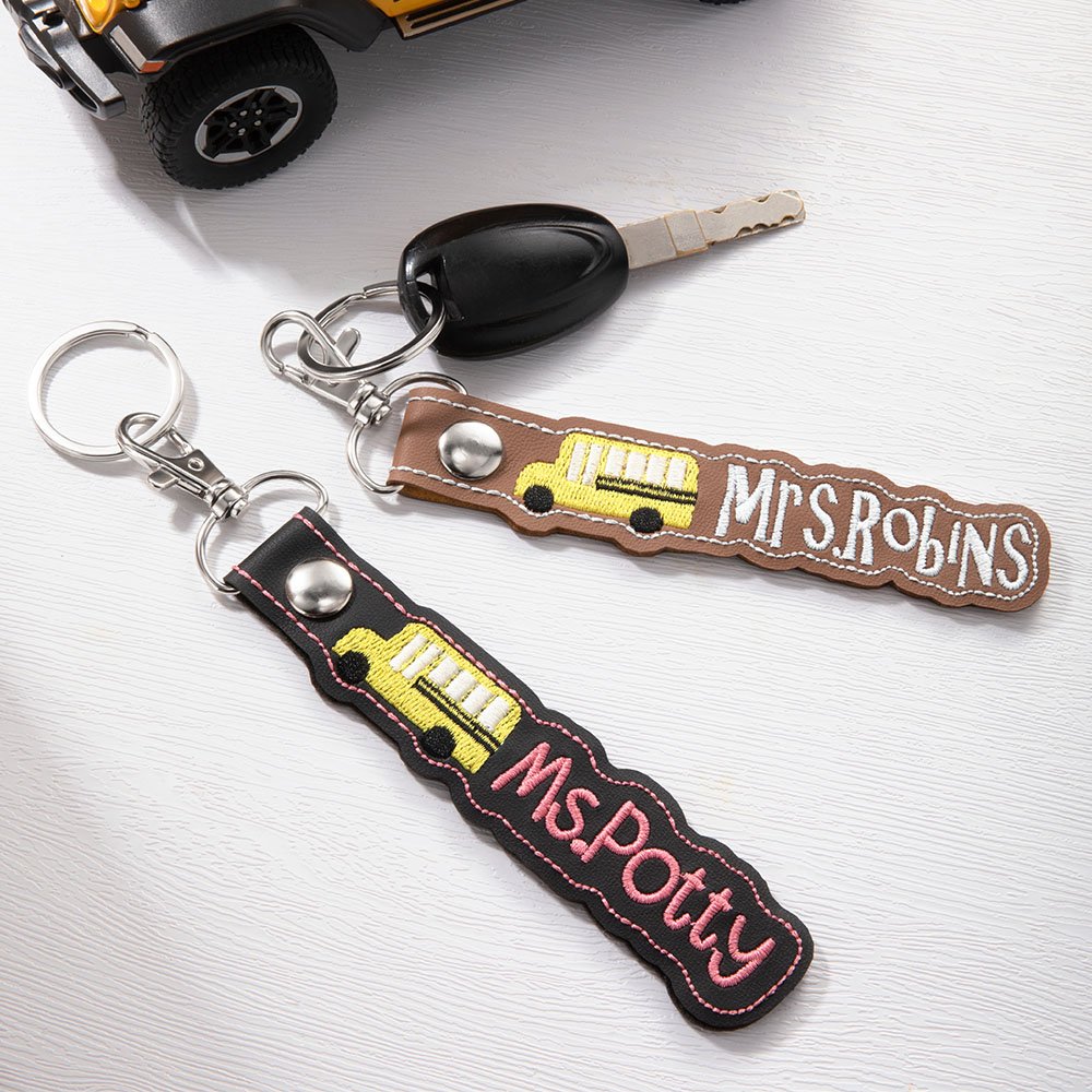 This colourful leather keychain features a cute cartoon bus design, making it a unique and Personalized gift. Making it truly special for the recipient is the embroidered name. The school bus element is designed to ensure the safety of students riding the school bus and to provide a convenient, comfortable and rewarding ride experience, expressing gratitude to the school bus driver.