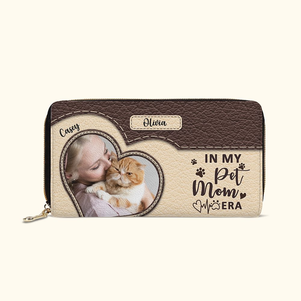 This women's wallet has 8 different colors, the design of the wallet is stylish and warm, the front of the wallet is printed with a heart-shaped photo of the pet, and the right side of it is printed with the words "in my pet mom era"., you can also customize the pet's name on the wallet so that the wallet becomes more Personalised.