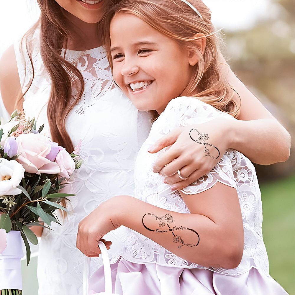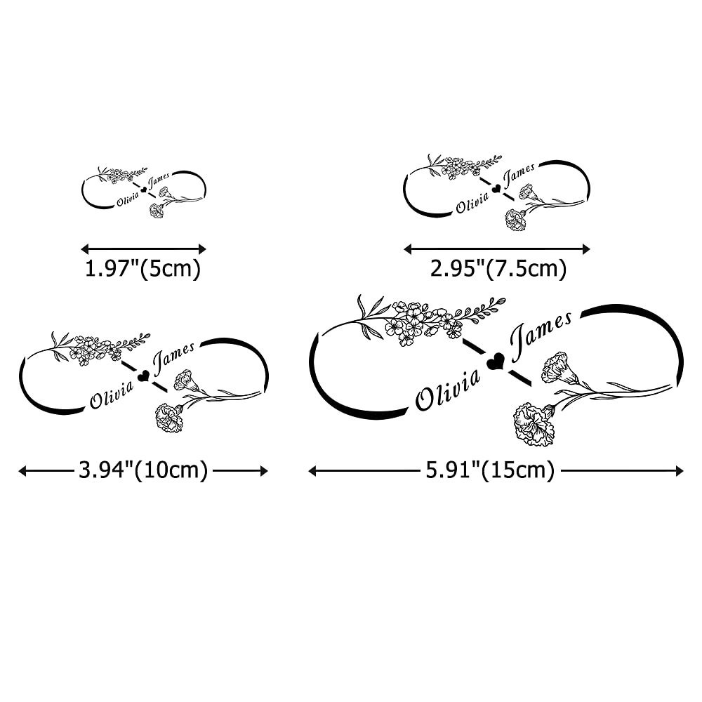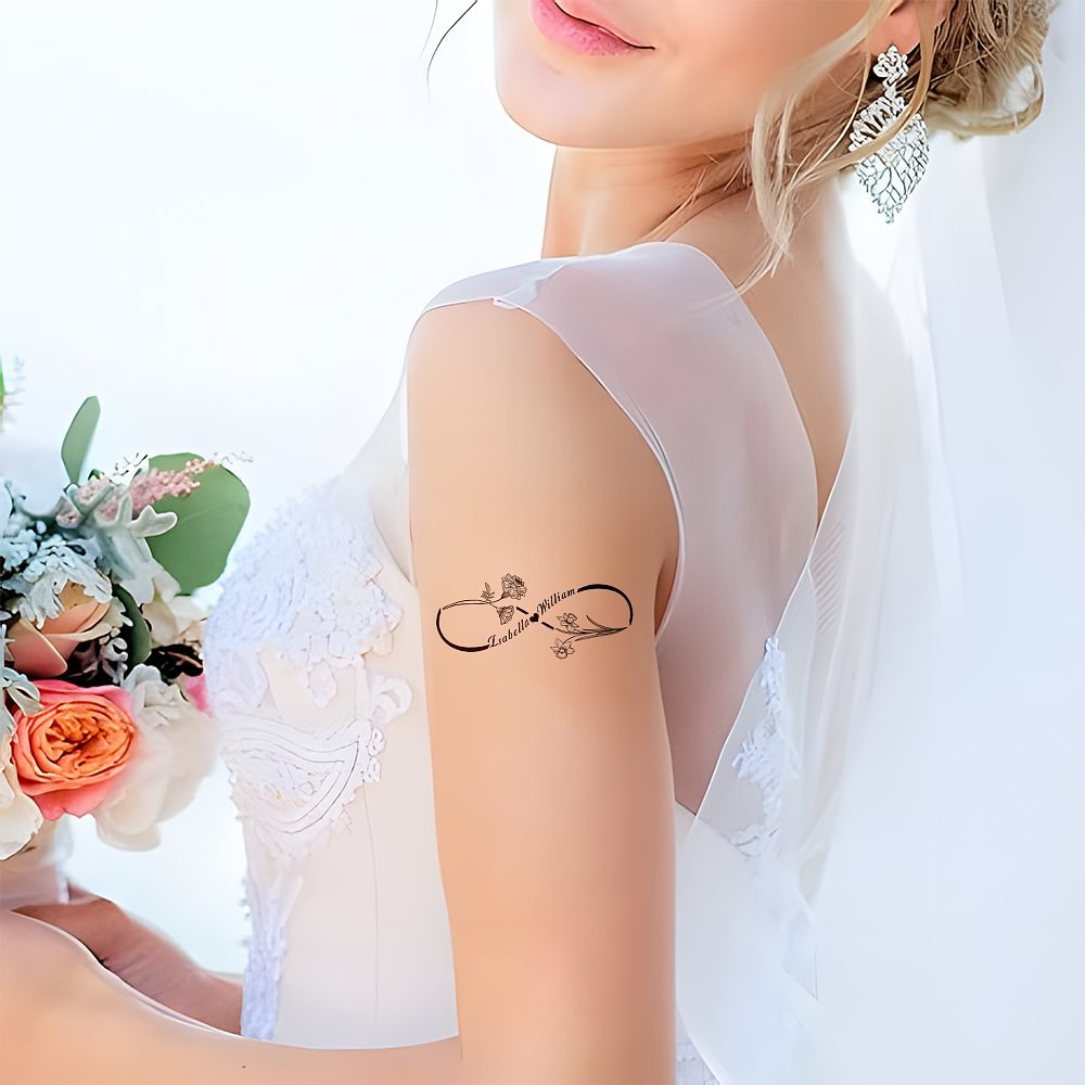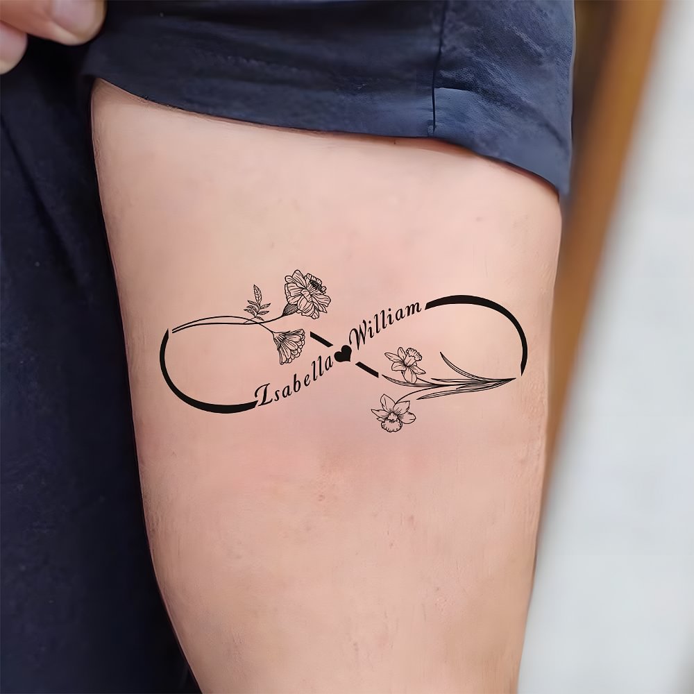 This tattoo connects the names and birth flowers of two people through an interwoven infinity symbol, symbolizing their unique personalities and eternal connection. Each flower corresponds to the traditional flower language of the birth month, allowing the tattoo to convey a unique feeling and care.