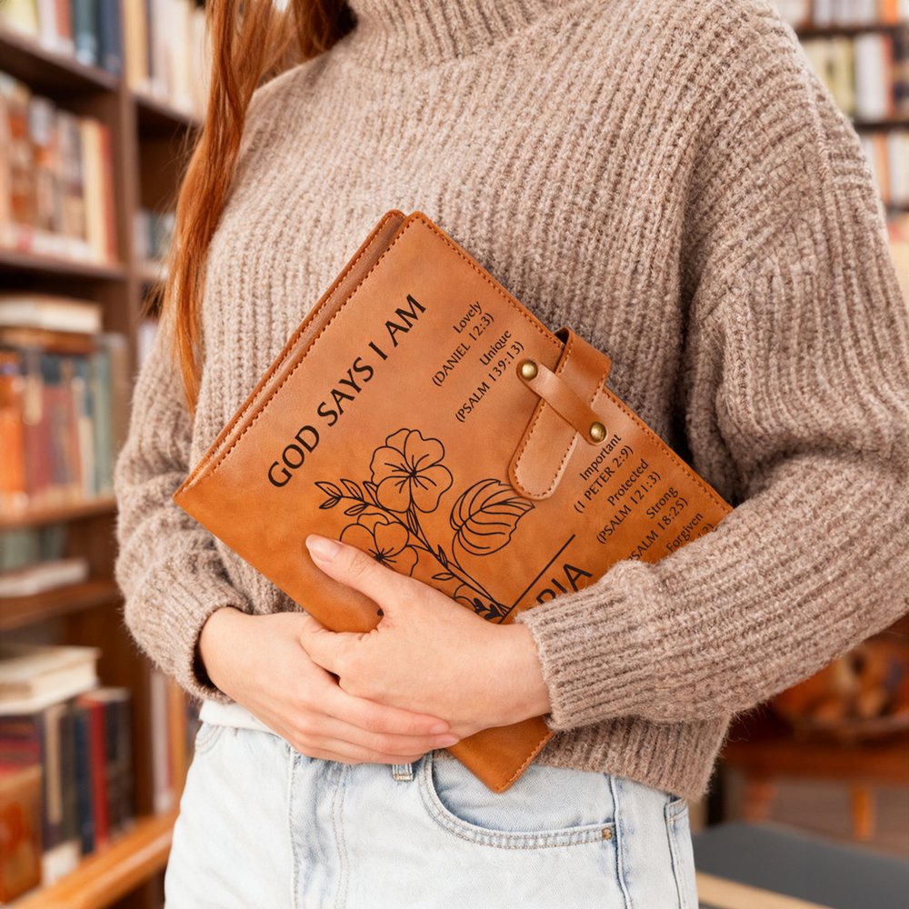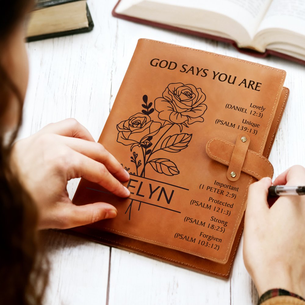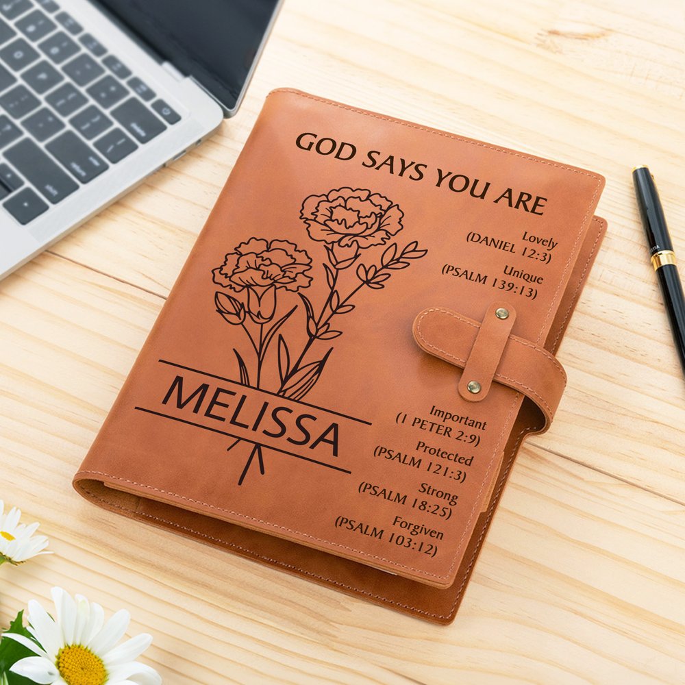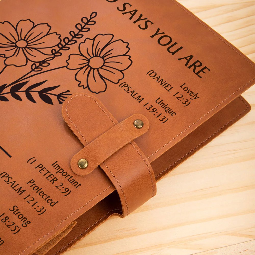 This leather notebook showcases a lined birth flower paired with a collection of affirming Bible verses. You can pick a birth flower from 12 monthly selections, add a custom message, and include a name, transforming the notebook into a one-of-a-kind keepsake that merges personal identity, spiritual motivation, and functional design.