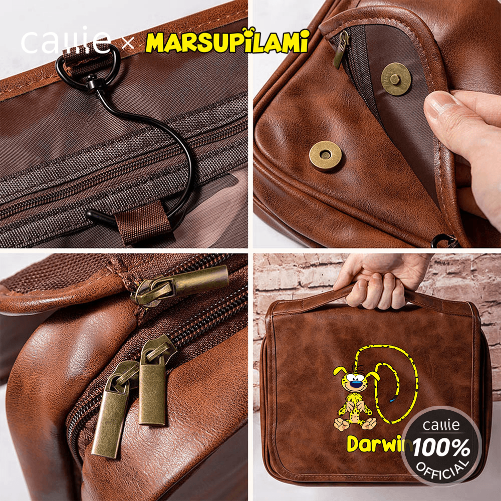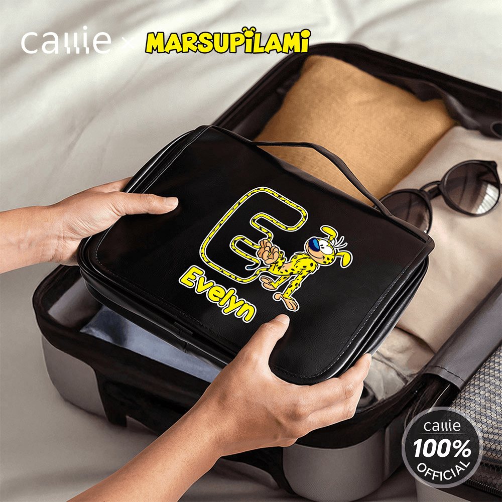 You can choose the cute cartoon image pattern of Tail-Bouncing Matthew, which was created by Belgian cartoonist André Franquin in 1952. Marsupilami is a jungle-dwelling creature with yellow fur, black spots, and a super flexible, long tail. This toiletry bag allows for personalized name and initials customization, blending a rugged coolness with a unique identifier.