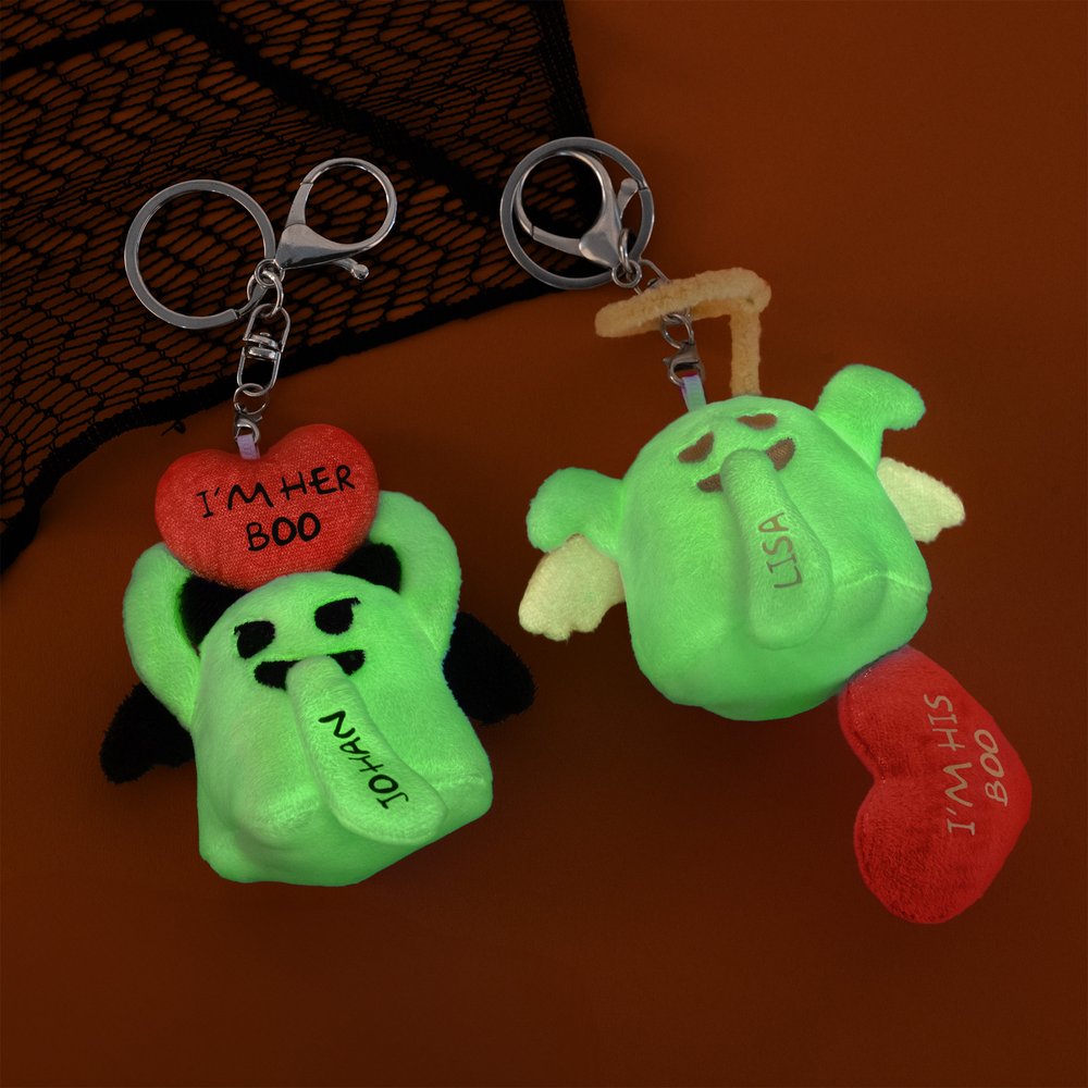 This charming keychain features a whimsical choice between a cartoon plush devil or angel, complete with adorable designs and a heart accent. The option to customize it with names and sweet messages adds a personal touch, making it a delightful accessory that captures the festive spirit and the warmth of affection.
