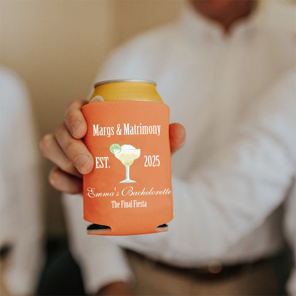 Our "Margs and Matrimony" can cooler can be customized with the year and text to add a personal touch to your drinkware.