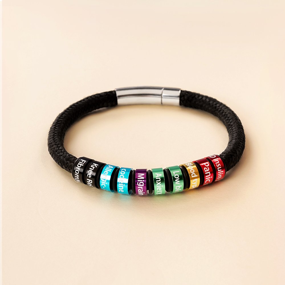 This medical alert bracelet comes with a circular ring that can be engraved. Each ring is personalized according to your important medical information.