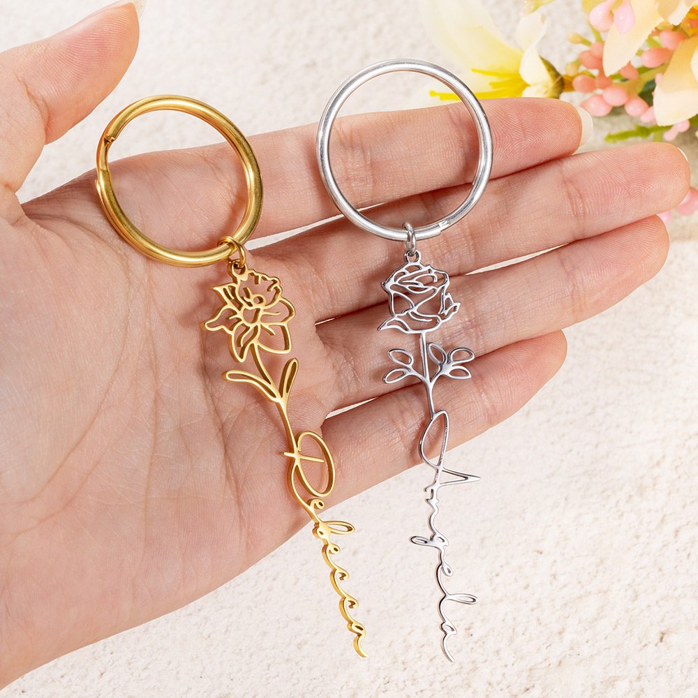 Our birth flower keychain offers a unique blend of elegance and personality. Choose from 12 birth flowers and customize it with her name, making it a keepsake that she can carry everywhere.