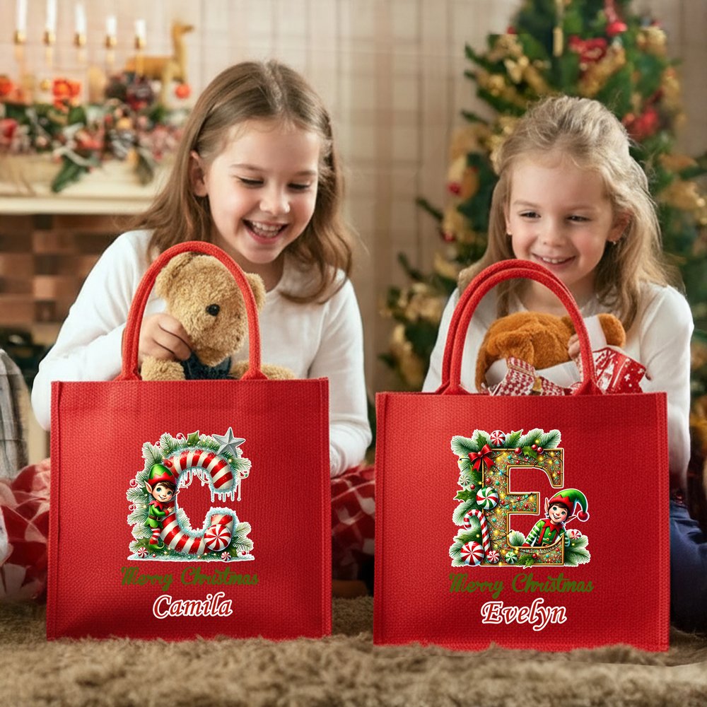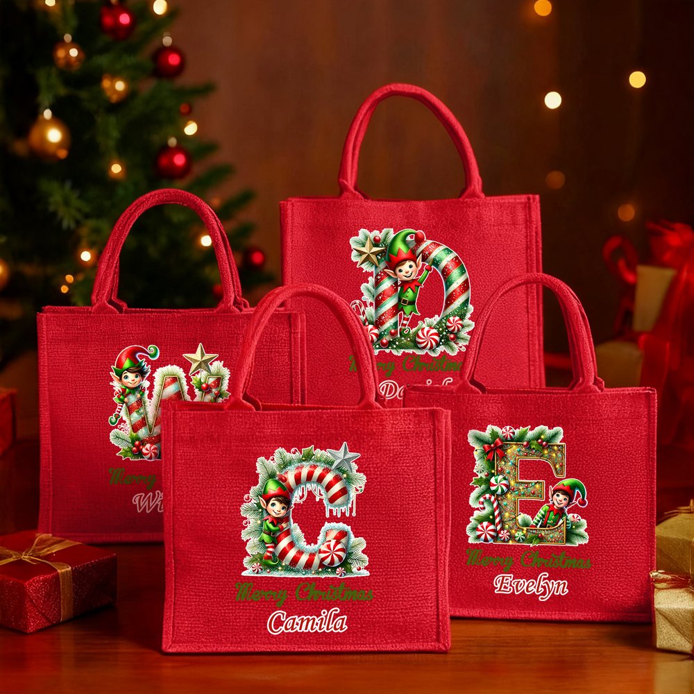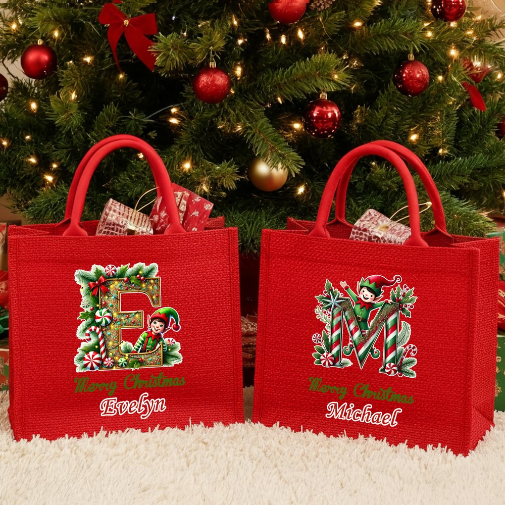 This festive bag features a lively Christmas elf surrounded by Sweets canes, pine wreaths, and shimmering stars, creating a joyful holiday scene. You can personalize it with a name or initials, while the classic "Merry Christmas" greeting in traditional red and green instantly brings holiday cheer to life. Each bag becomes a unique symbol of the season!