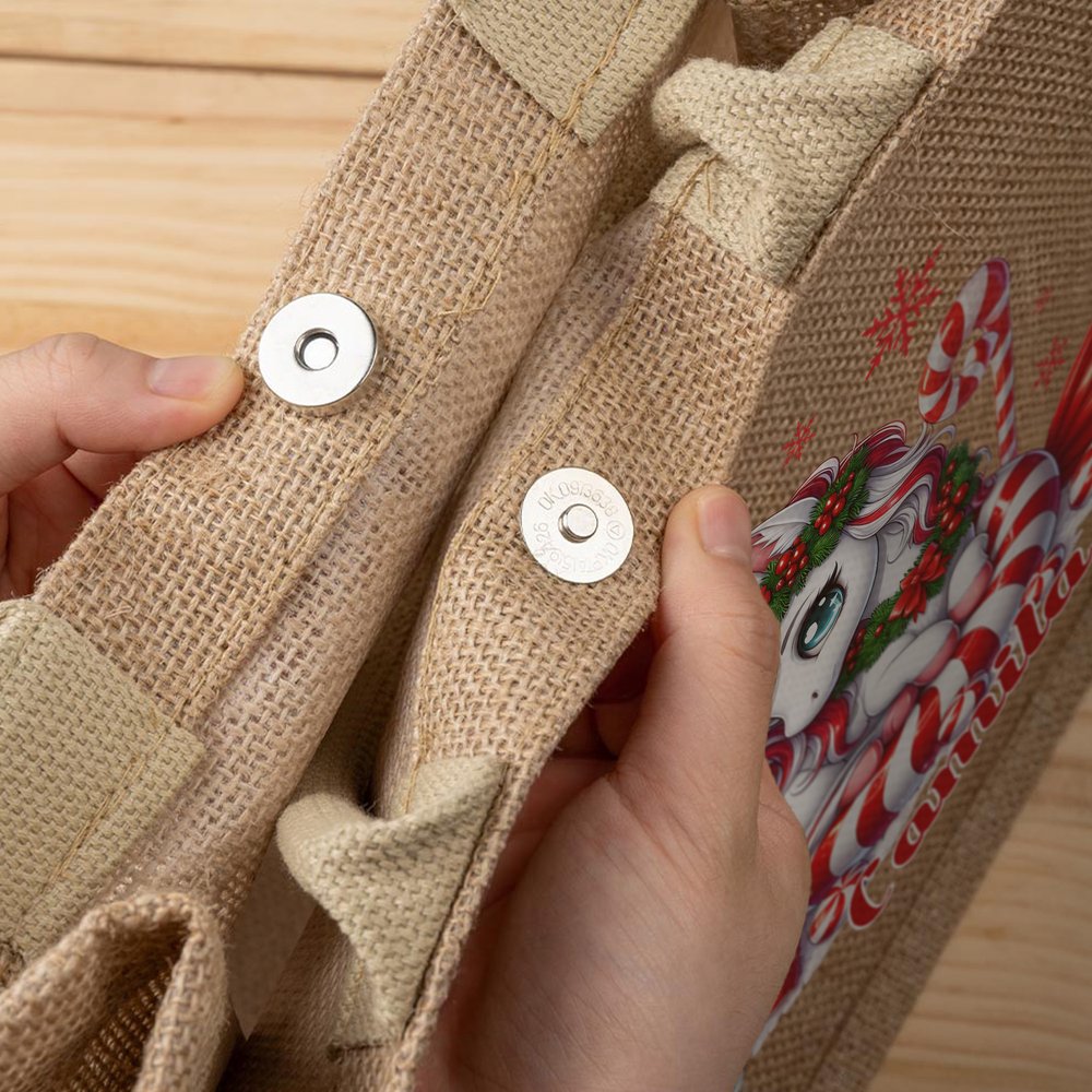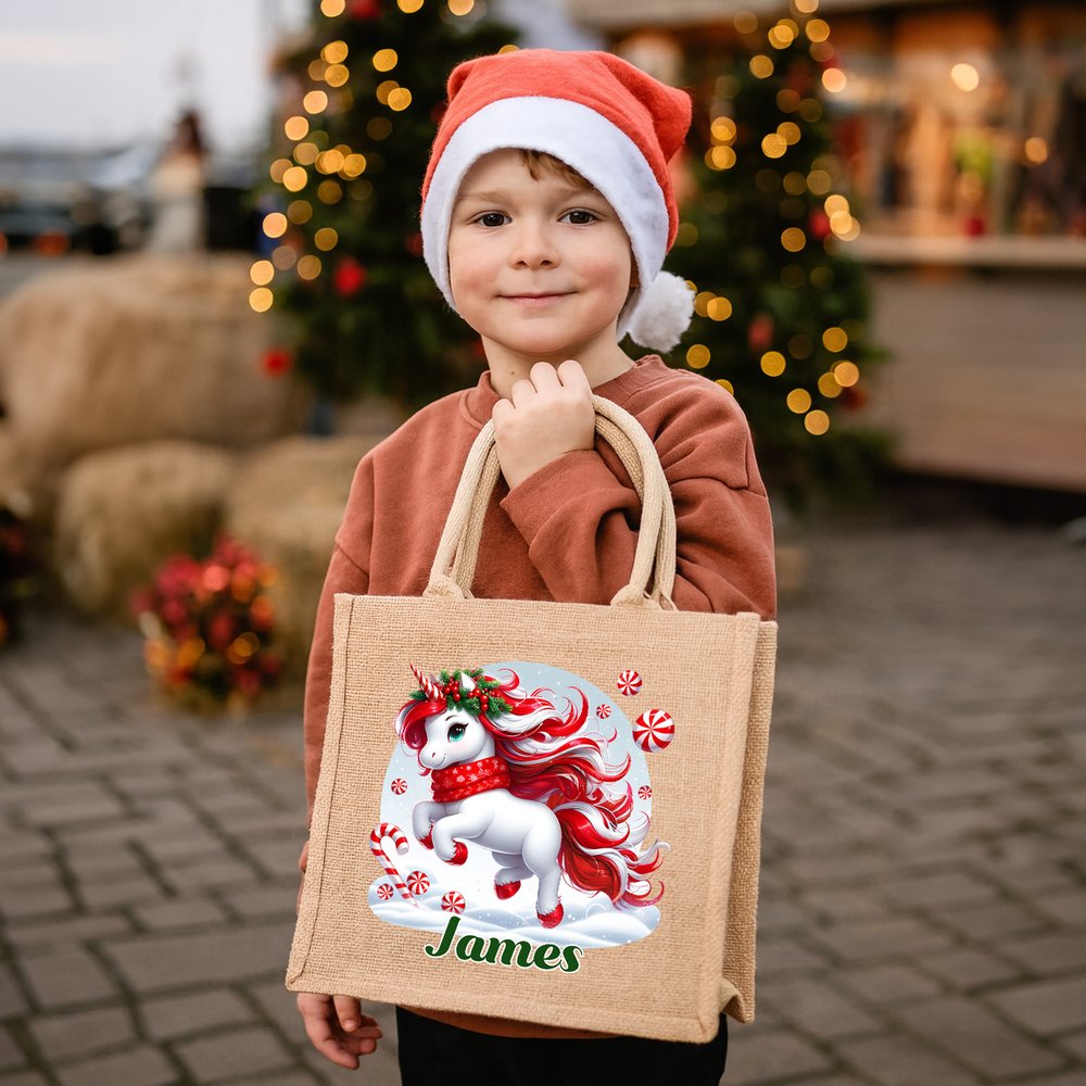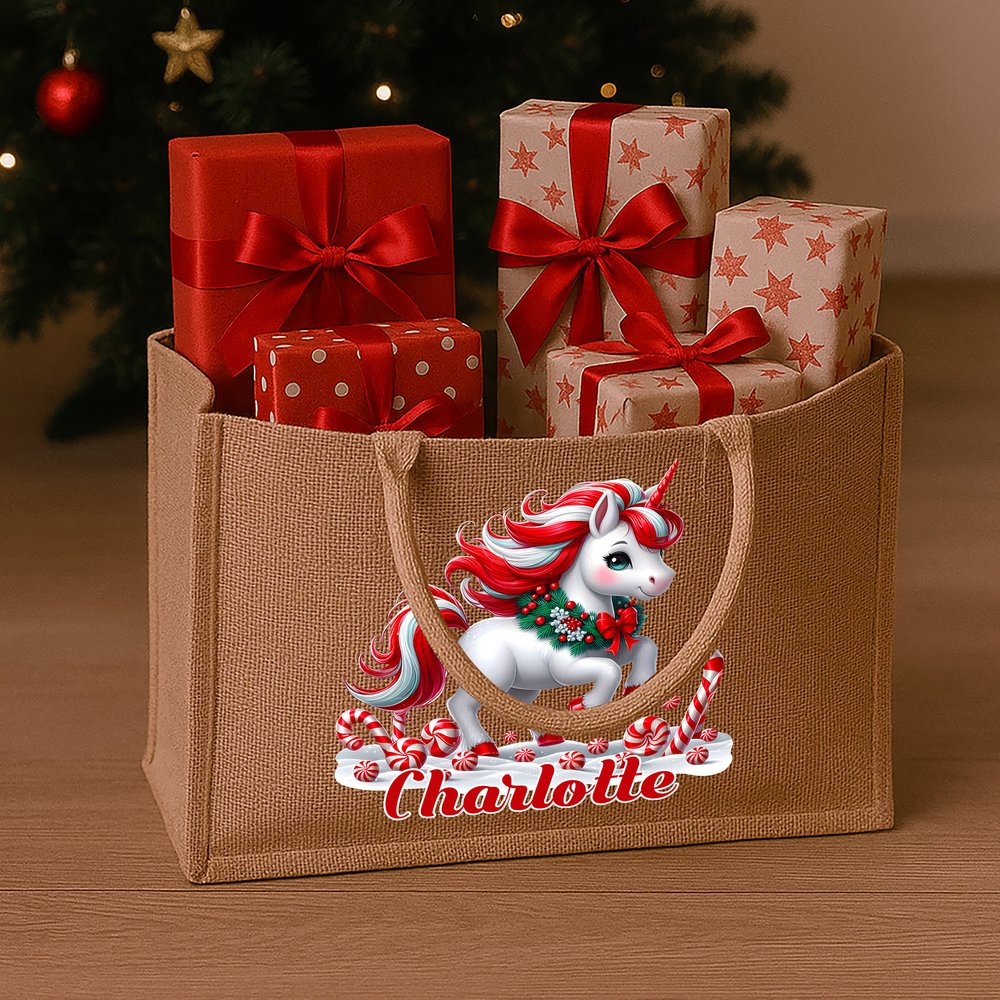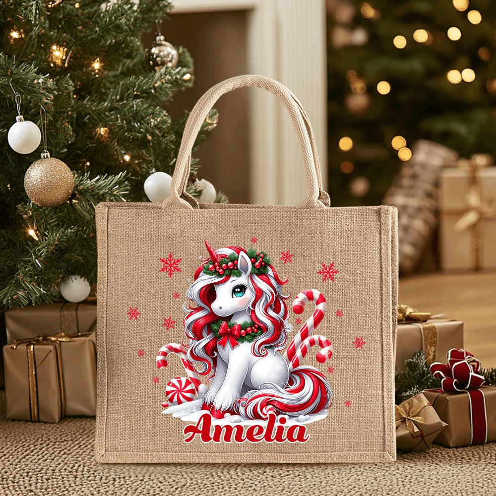 Personalized Merry Christmas Fantasy Unicorn Large Jute Tote Bag with Name Christmas Eve Party Gift for Girls Kids