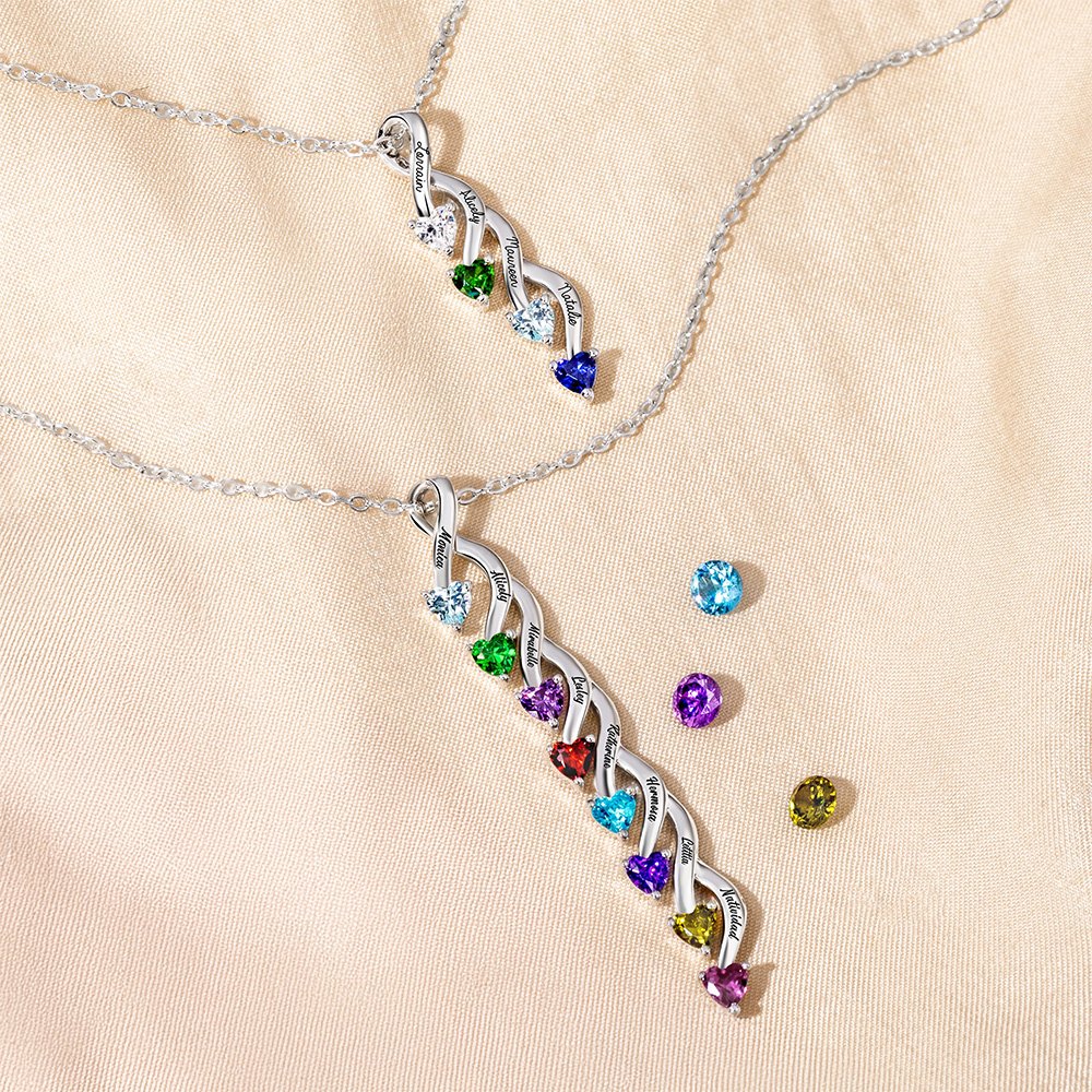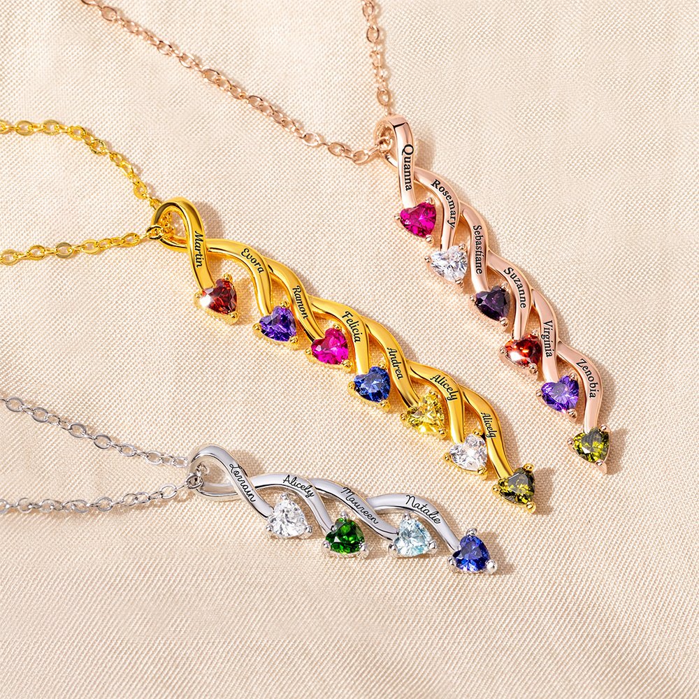This necklace features a classic birthstone design that symbolizes love and connection. This thoughtful design allows you to customize the necklace with 2-8 birthstones and corresponding names, with each additional stone representing an extra layer of love, making it a beautiful tribute to your family.