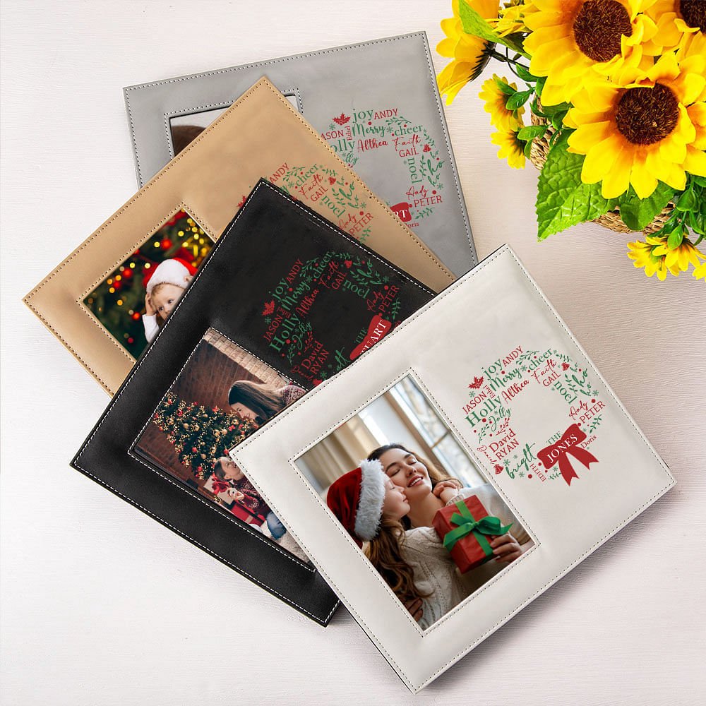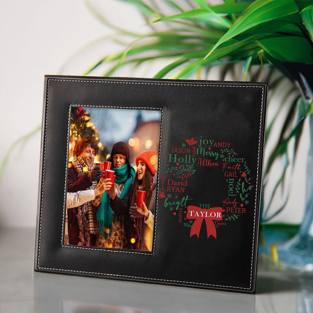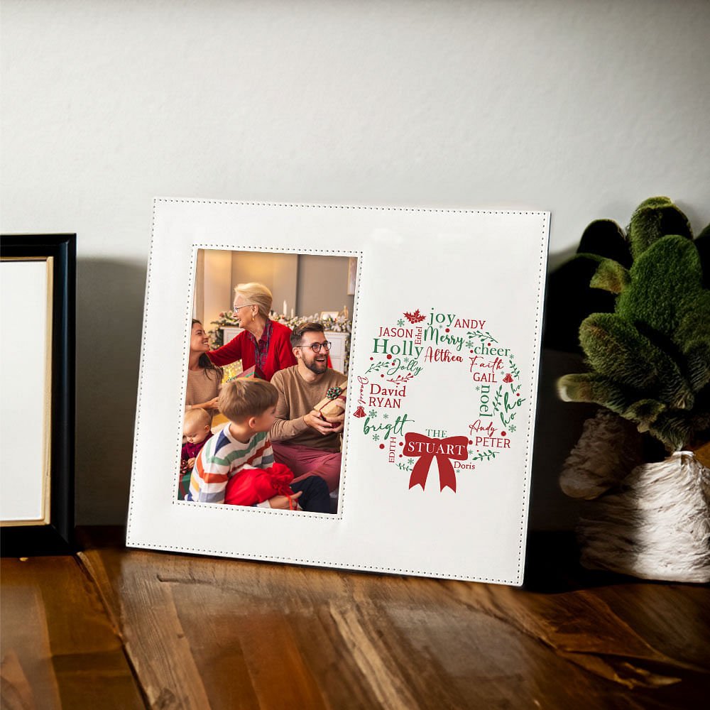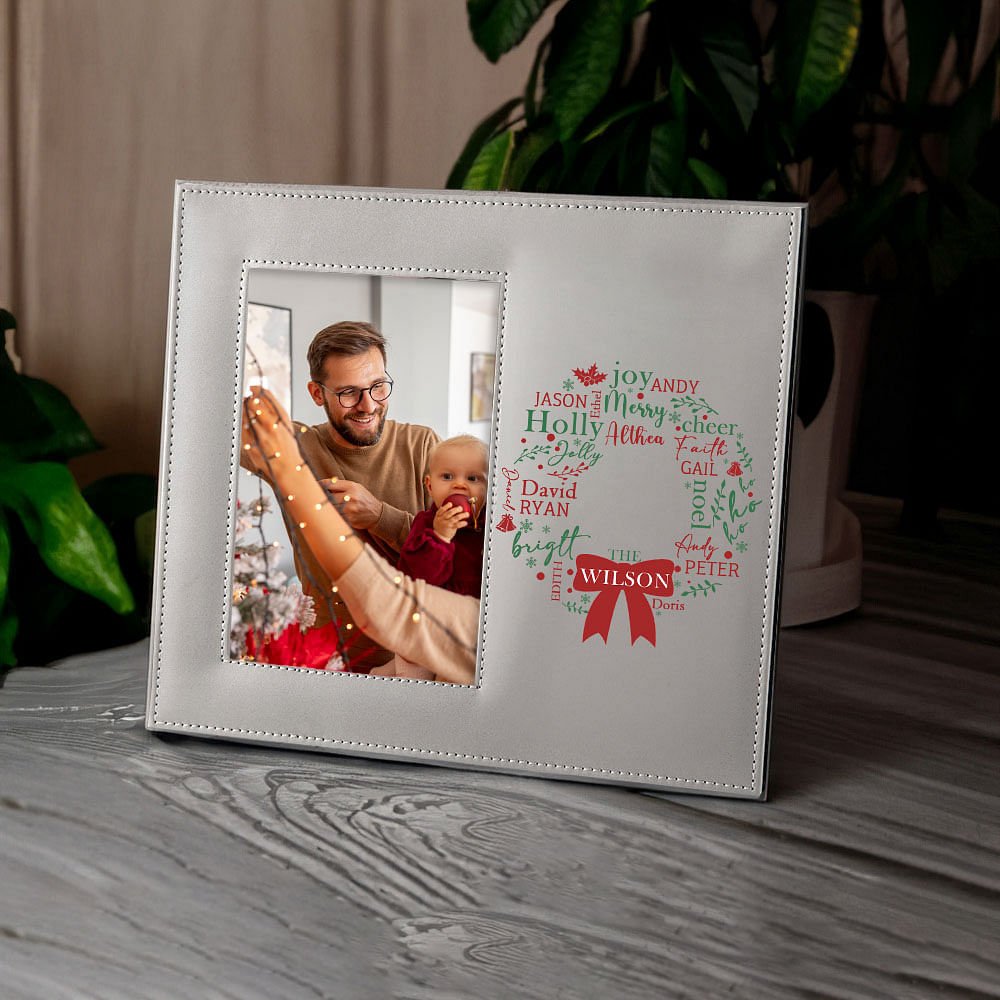 This Personalized mistletoe wreath leather photo frame is the perfect guardian of your family's warm memories. It carries your precious photos and allows the delicate mistletoe wreath to cleverly integrate 1-13 family members' names so that each name shines with the warm light of home.
