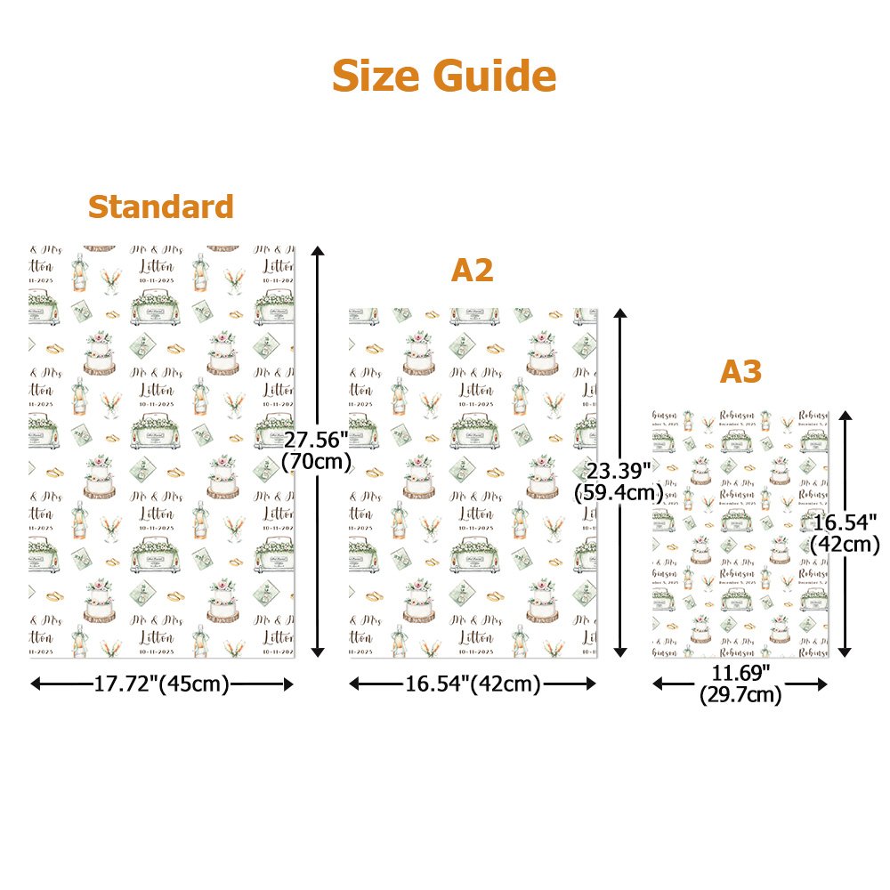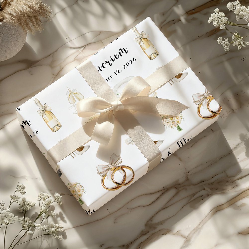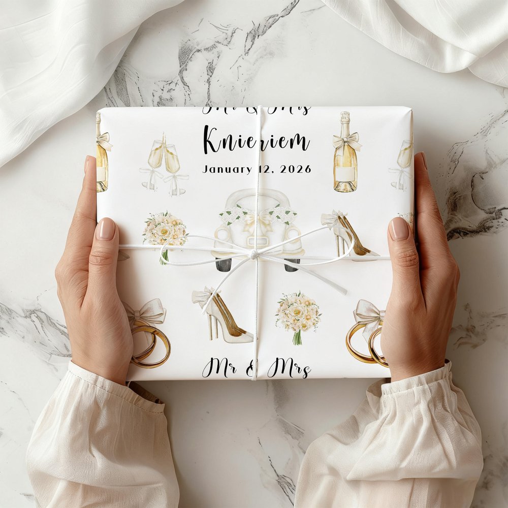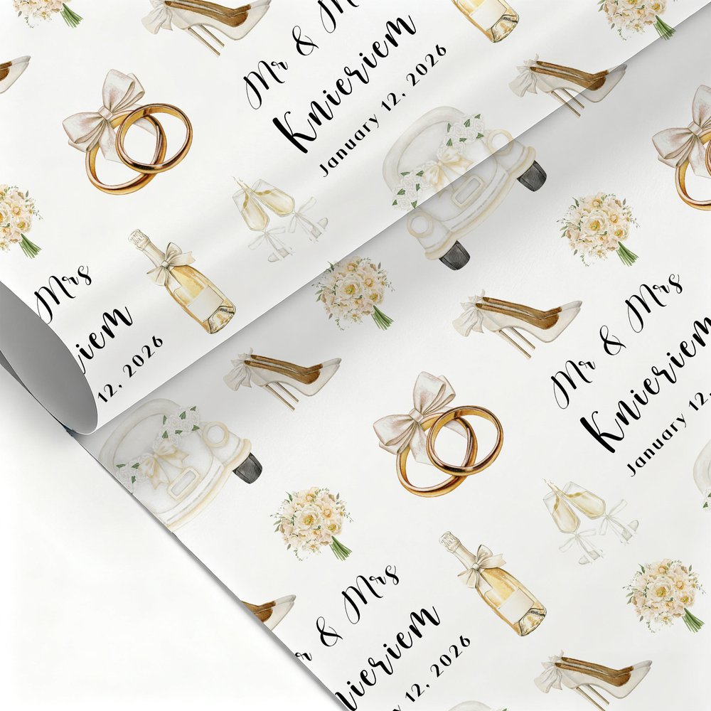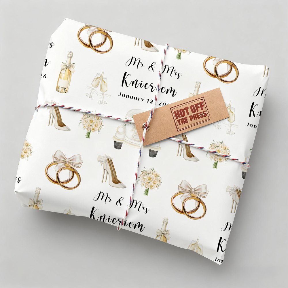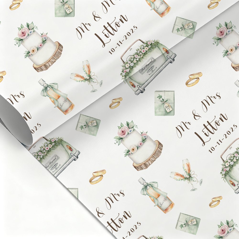 This gift wrapping paper features the classic "Mr & Mrs" wording, paired with two distinct design options: a champagne-themed collection themed around rings, and a light green-themed collection featuring green retro wedding cars. Additionally, this wrapping paper offers personalized customization services. You can add your family name and a special date, such as your wedding anniversary, engagement date, or any other memorable occasion, to the wrapping paper.