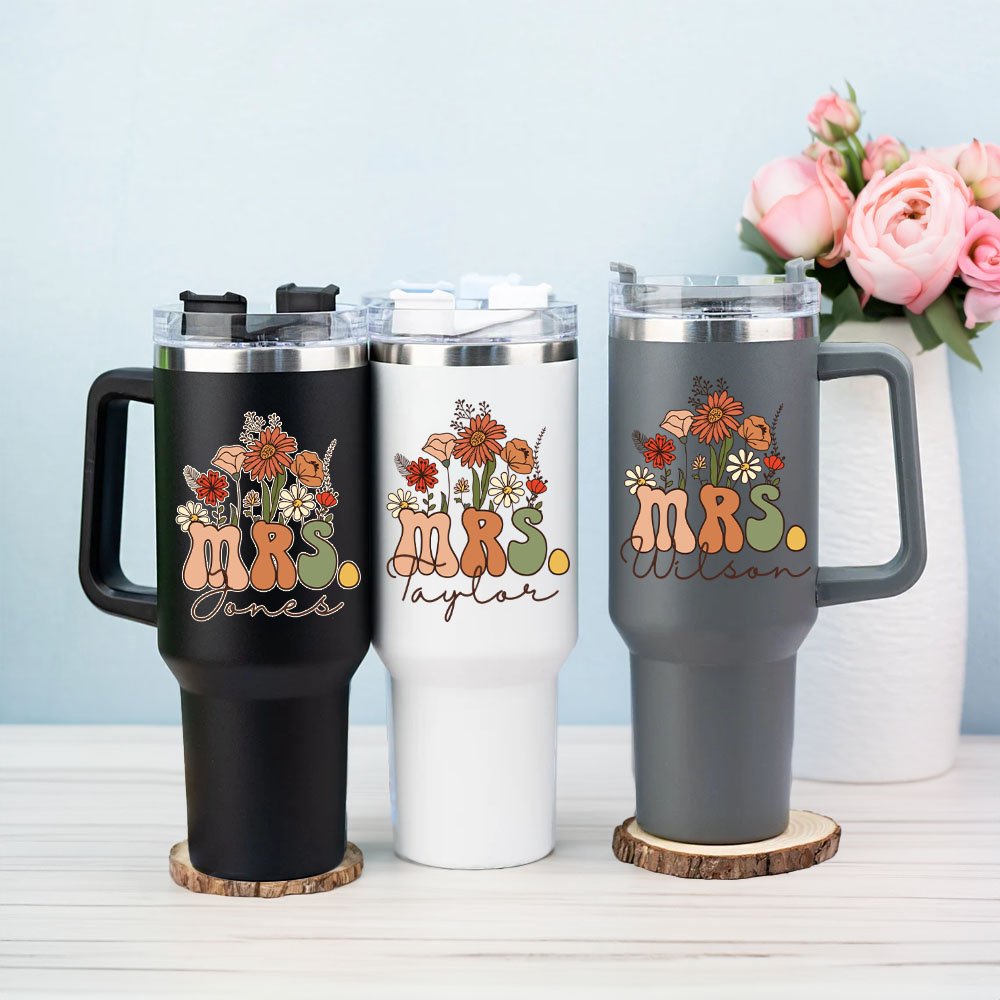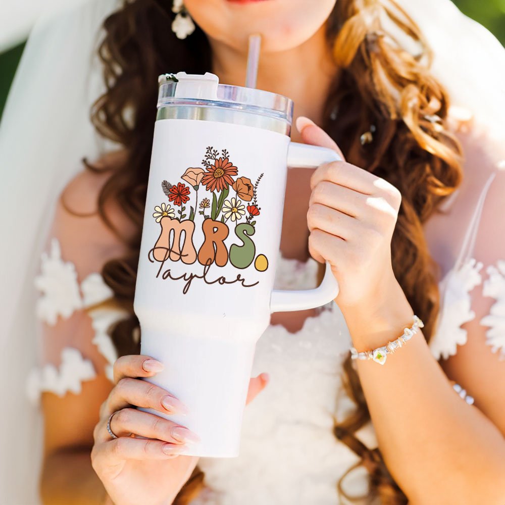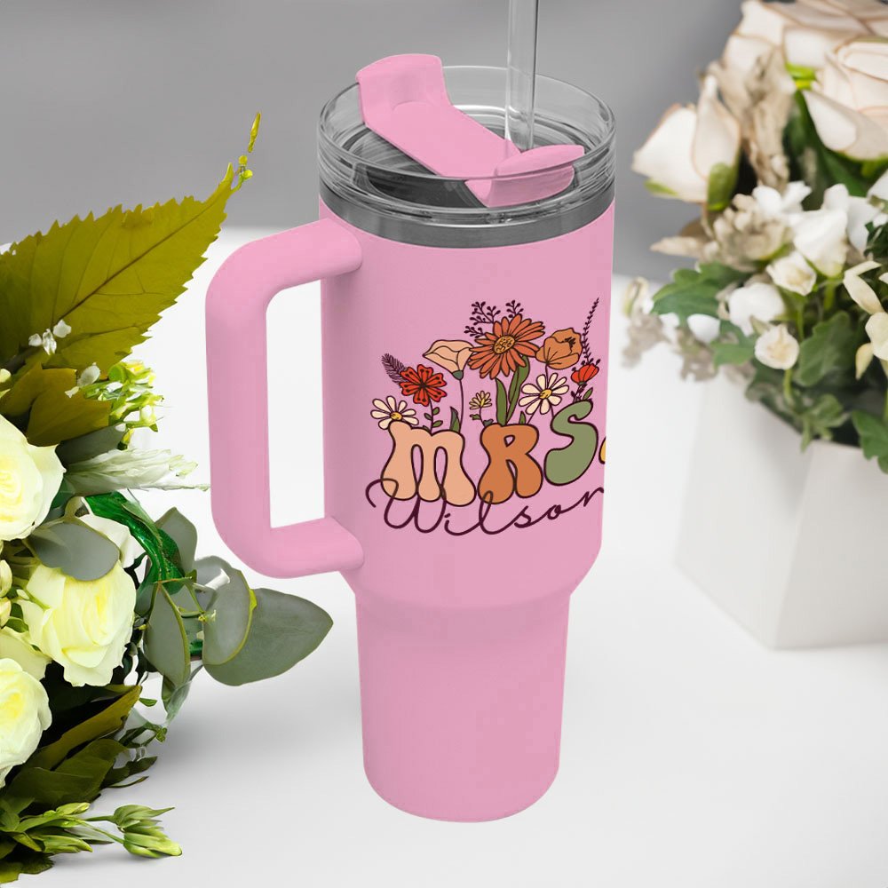 This 40oz tumbler features a vibrant, eye-catching retro wildflower design. Personalize it with the title "MRS." for any name you choose, creating a unique and personalized beverage container.