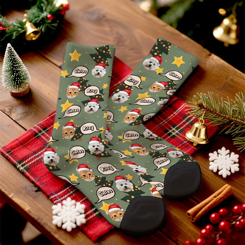 Personalized Multicolour 1-3 Pet Face Photos Christmas Hat Comfortable Mid-Calf Socks with Name Daily Use Christmas Gift for Pet Owners