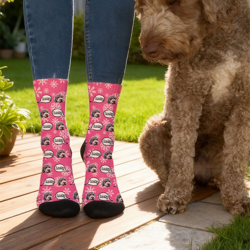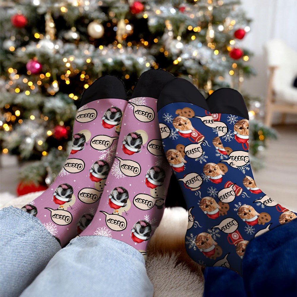 These socks feature custom 1-3 pet portraits, such as your dog in a Santa hat, printed with your pet’s name in playful speech bubbles and festive accents, including snowflakes and holiday patterns. Choose from multiple colours, blue, pink, and purple, to match your style, turning a basic sock into a unique tribute to your beloved pet that blends Christmas cheer with personal charm.