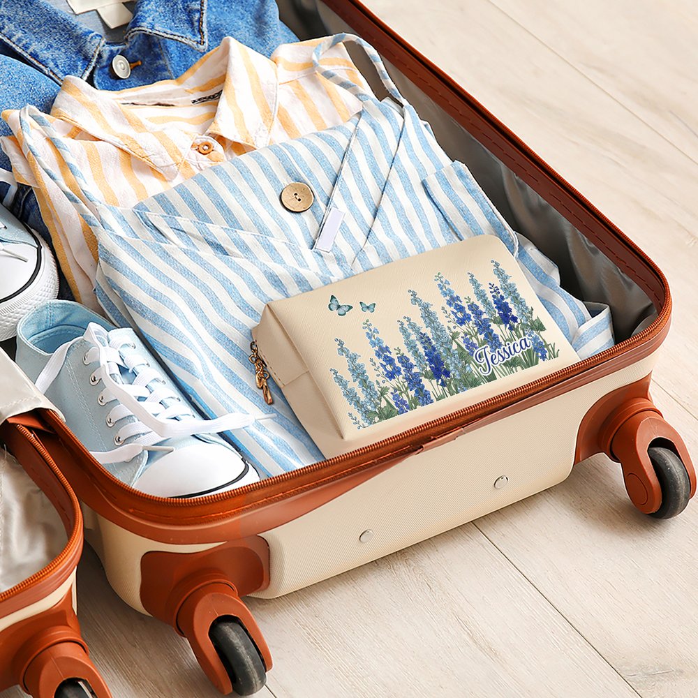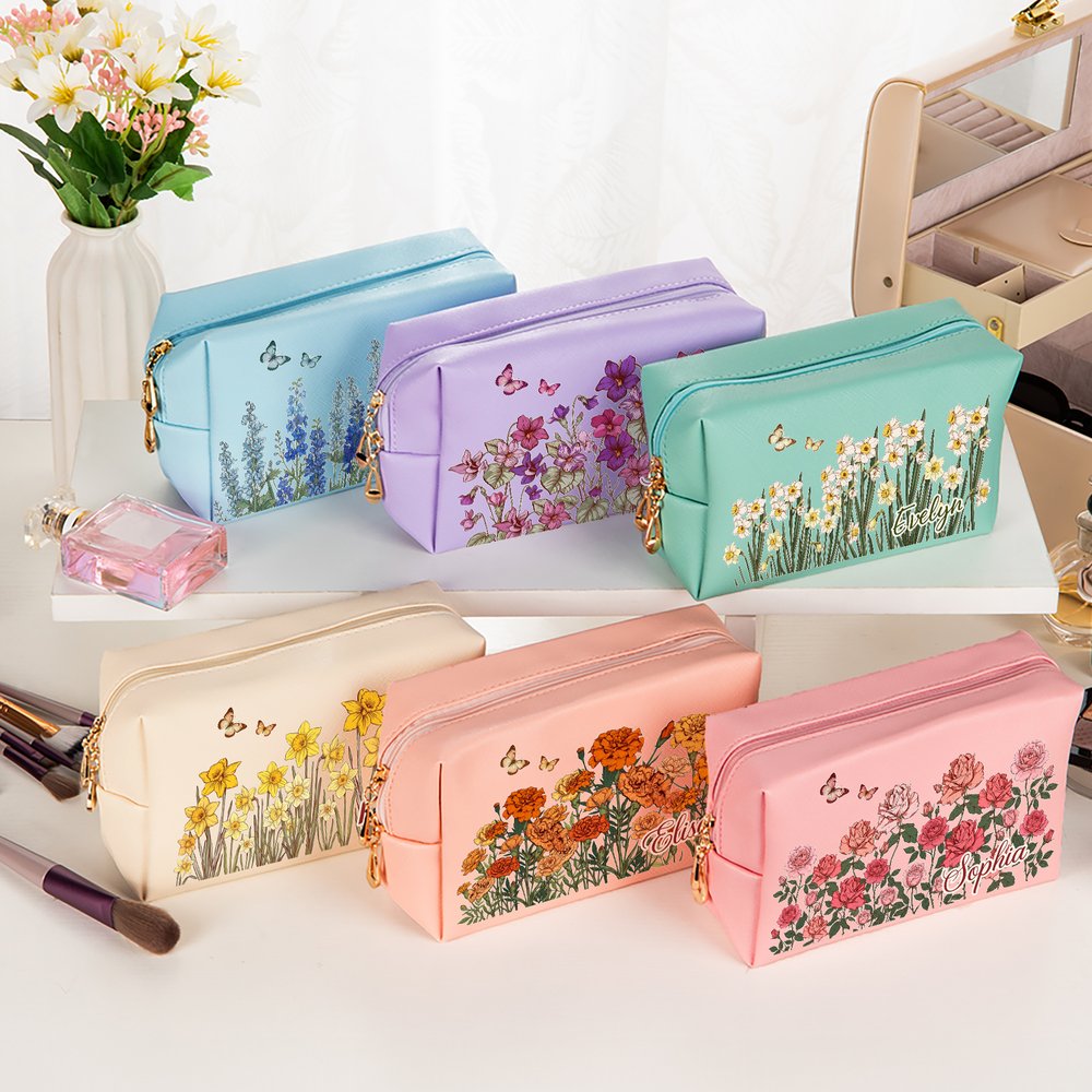 Personalized Multicolour Birth Flower Butterfly PU Leather Makeup Bag with Name and Zipper Travel Essentials Birthday Mother's Day Gift for Women