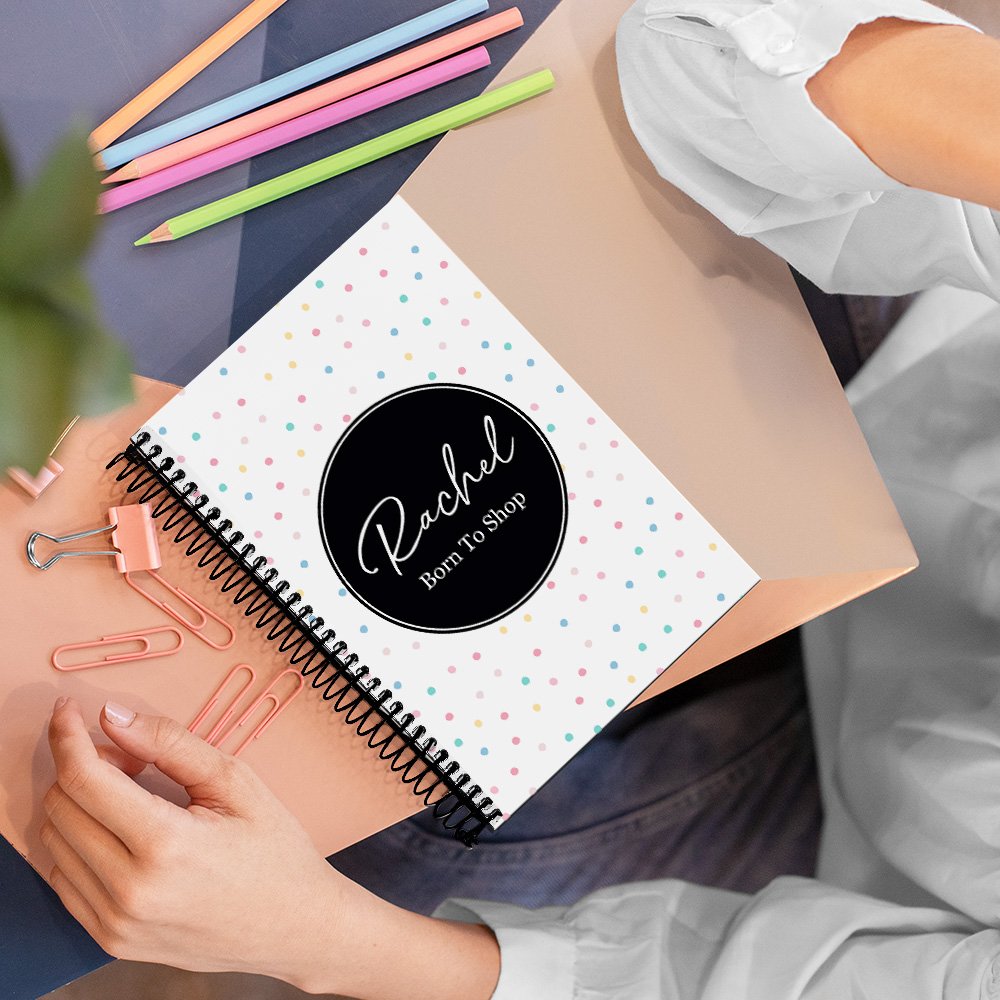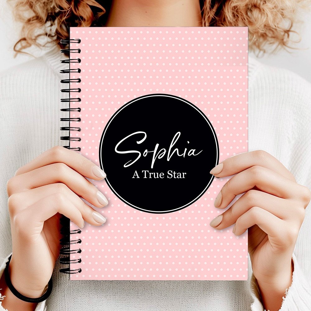 Personalise this notebook with a name and a unique text, such as "A True Star" or "Born to Shop," etc. This customization adds a special touch, turning a simple notebook into a meaningful gift.