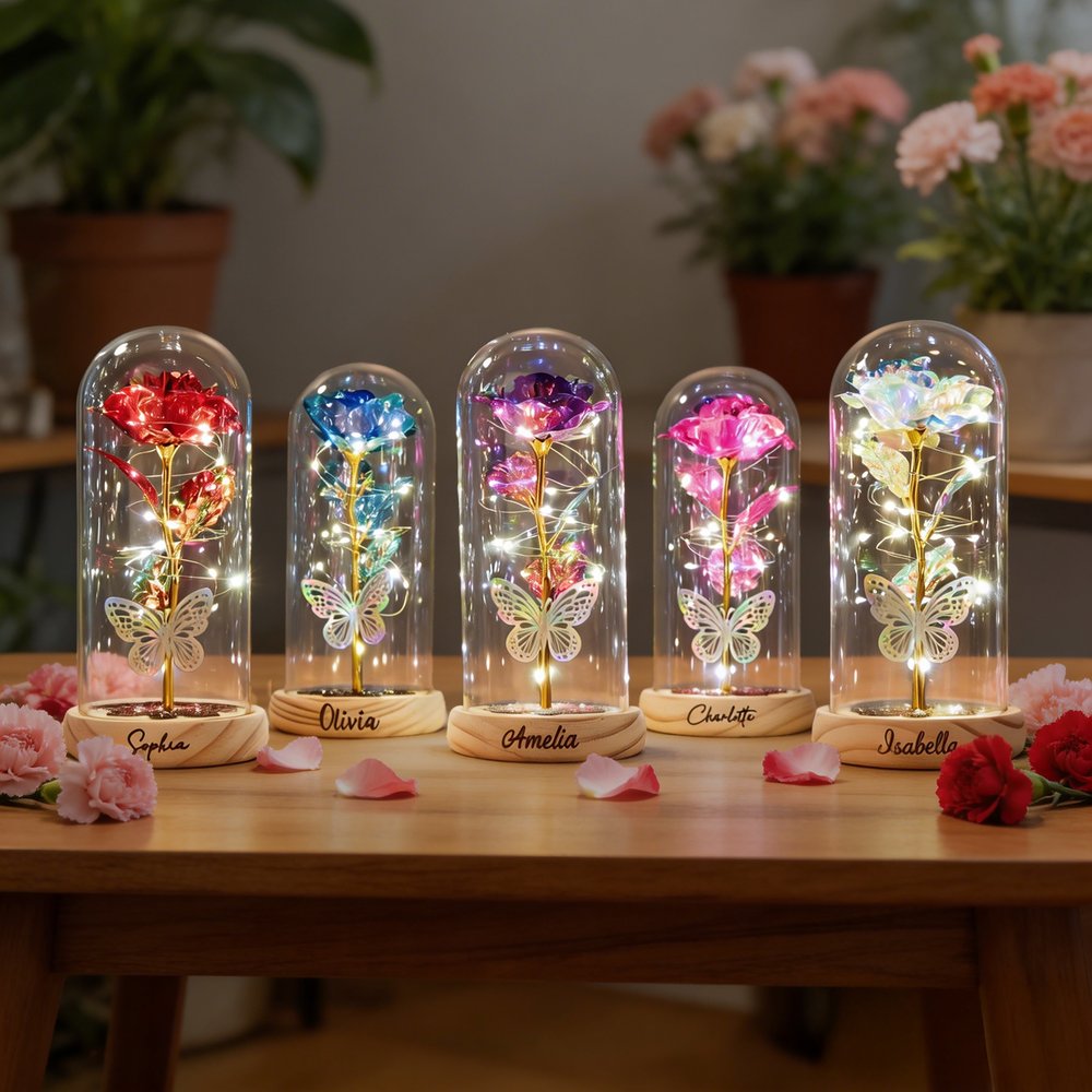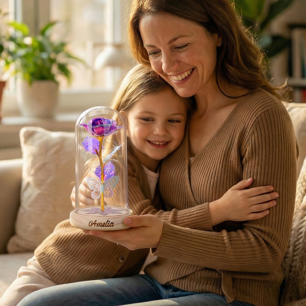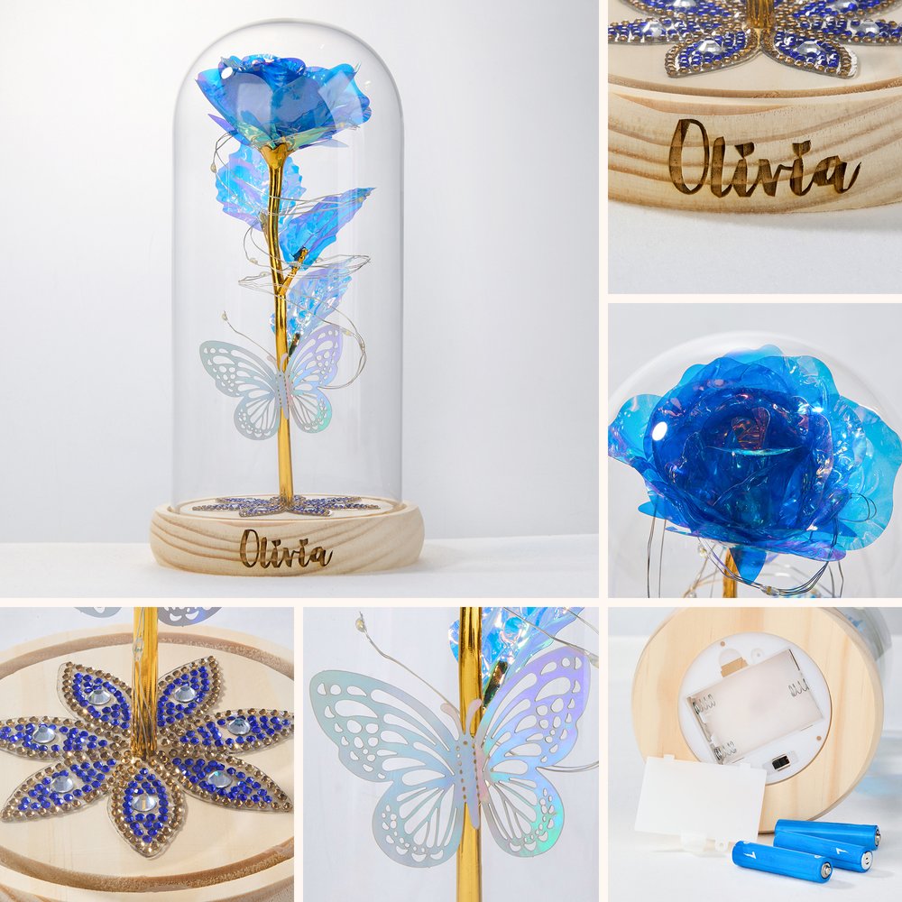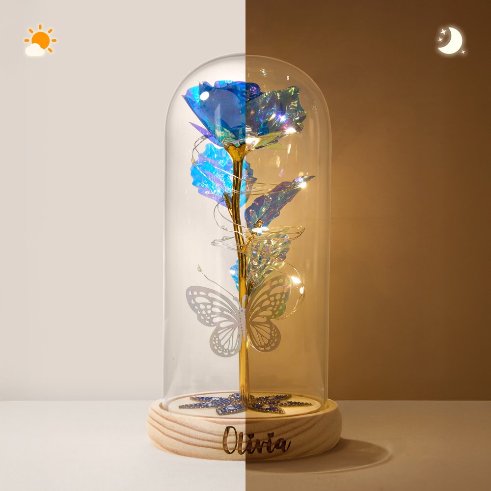 This stunning preserved rose gift blends timeless romance with heartfelt personalization, featuring a vibrant, gold-trimmed rose, delicate butterfly accent, and warm LED fairy lights, all encased in a clear glass dome. The light wooden base is fully customizable with a name, initials, or special message, turning a classic decorative piece into a one-of-a-kind keepsake that carries your unique love and sentiment.