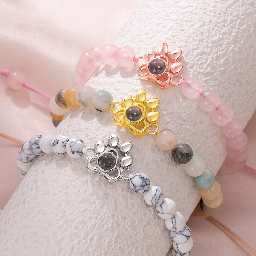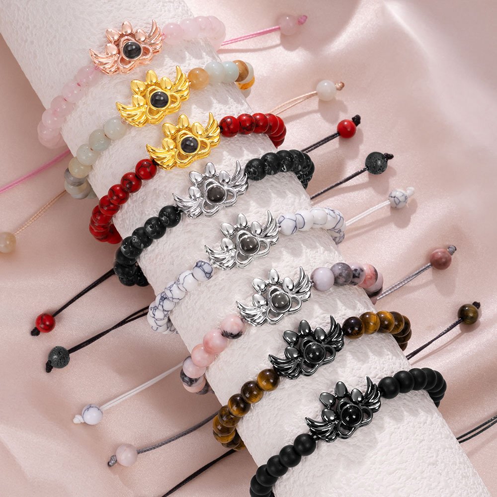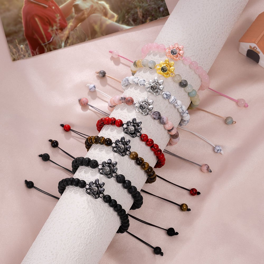 It is made from natural stone beads in different styles and features circular photo projections. With this bracelet, you can upload your favorite photos, take your loved ones, and cherish your memories and important moments.