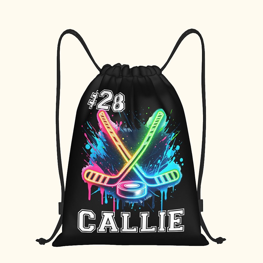 Our drawstring bag is simple, with a sporty hockey pattern printed on the front. The cool neon color combination is very sporty and modern technology style. You can customize your or your friend's name and number on the drawstring bag to create a unique souvenir, making it a fashionable and unique lifestyle accessory.
