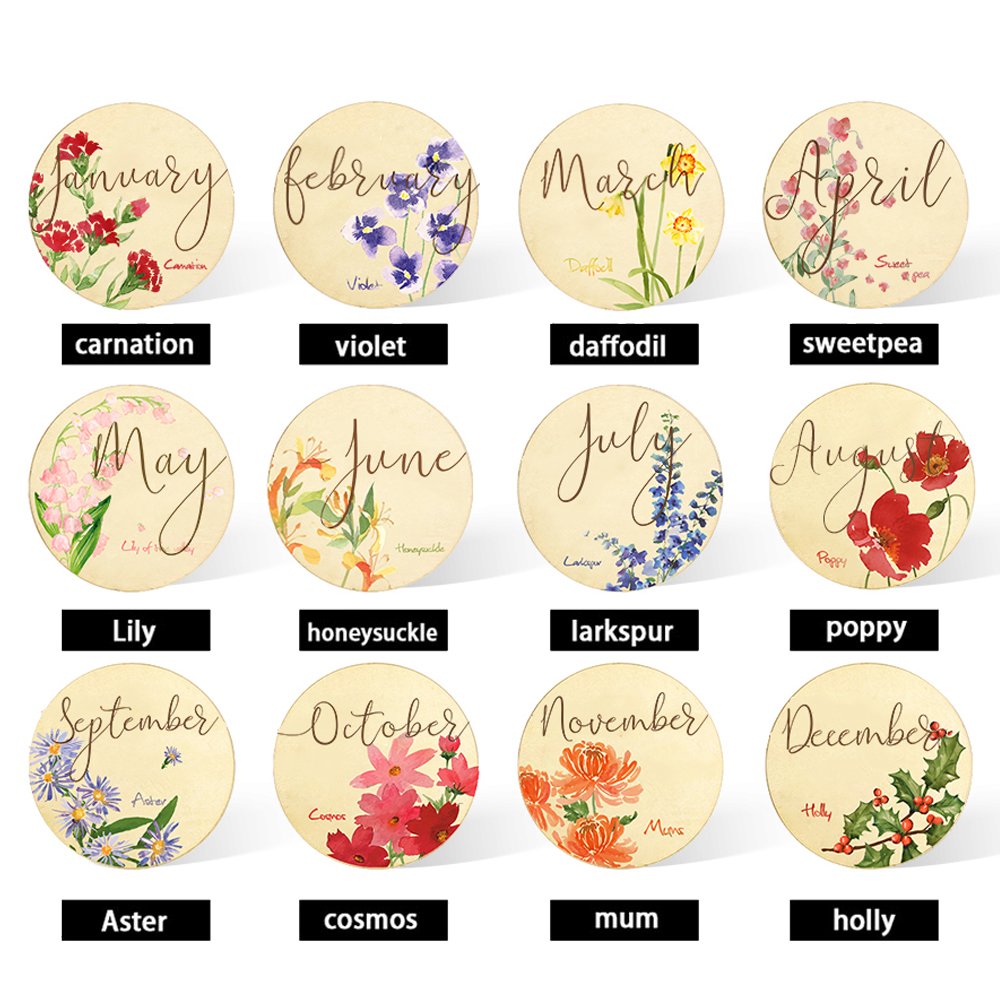 •12 Birthflowers's Meaning: Jan-admiration and deep love. Feb-faithfulness and modesty. Mar-new beginning and prosperity. Apr-innocence and loyal love. May-sweetness and purity. Jun-love and beautity. Jul-positivity and open heart. Aug-strength and faithfulness. Sept-love and affection. Oct-passion and creativity. Nov-loyalty and honesty. Dec-hope and good fortune.