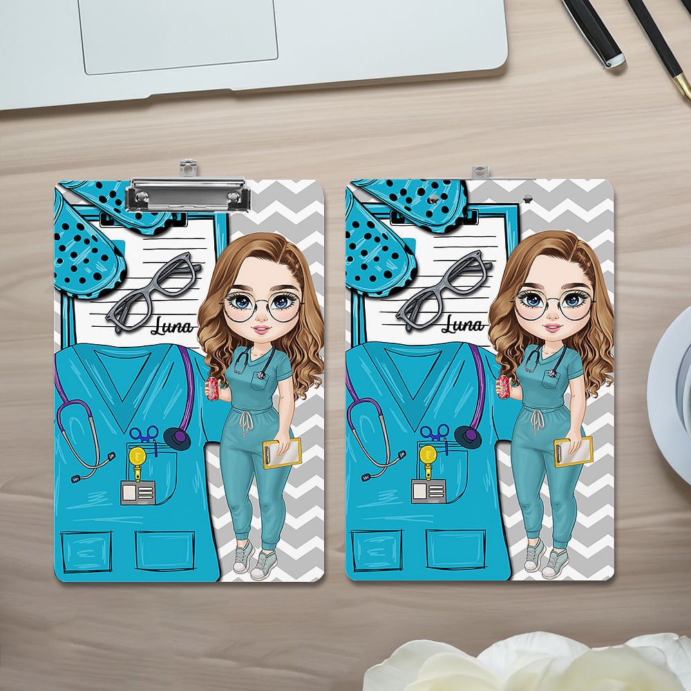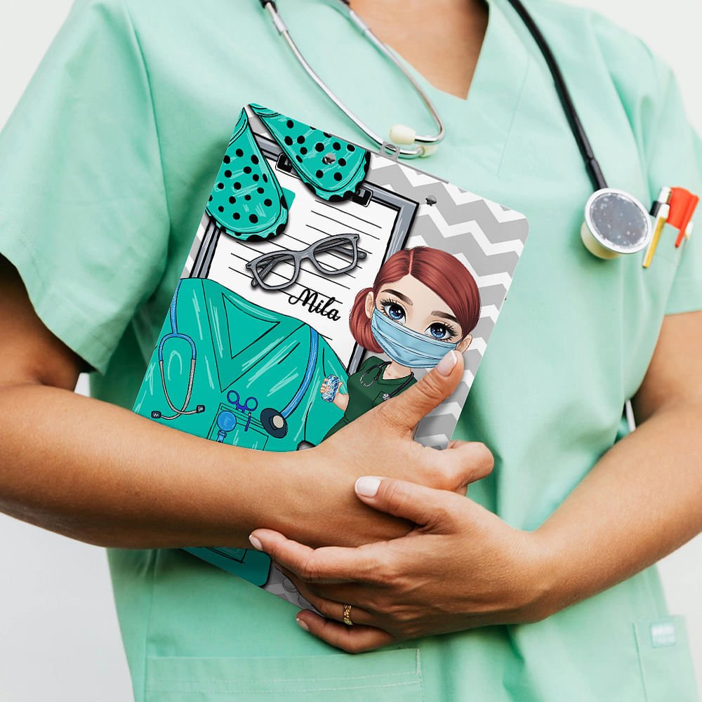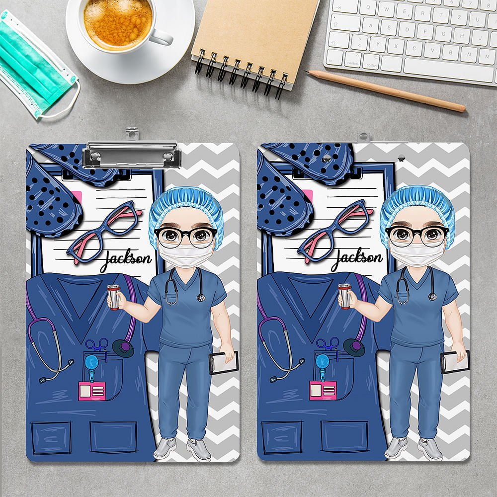 This clipboard has cartoon doctor and nurse characters printed in the middle, with a conspicuous surgical gown in the background, as well as patterns of glasses, slippers, medical records, etc., which vividly show all aspects of medical work and reflect the hard work of medical workers.