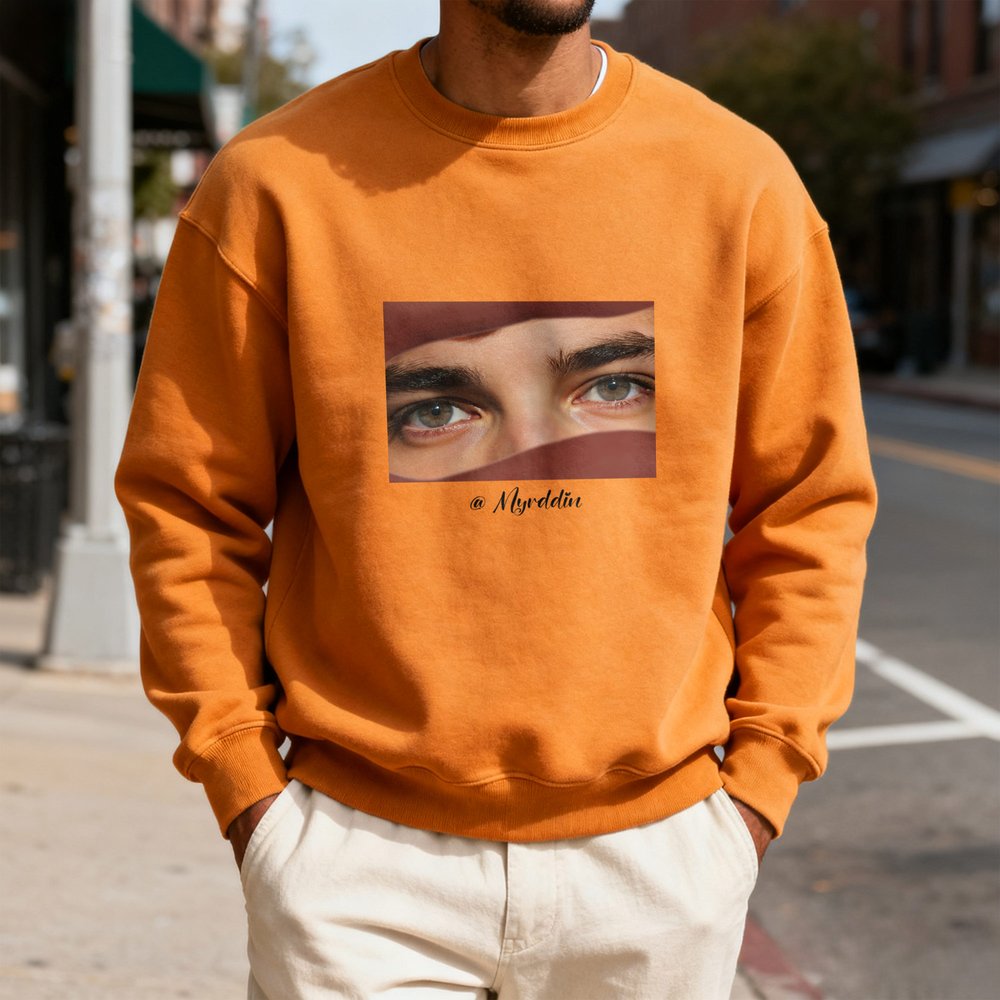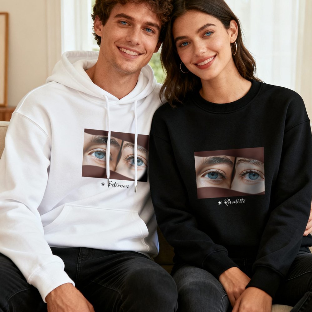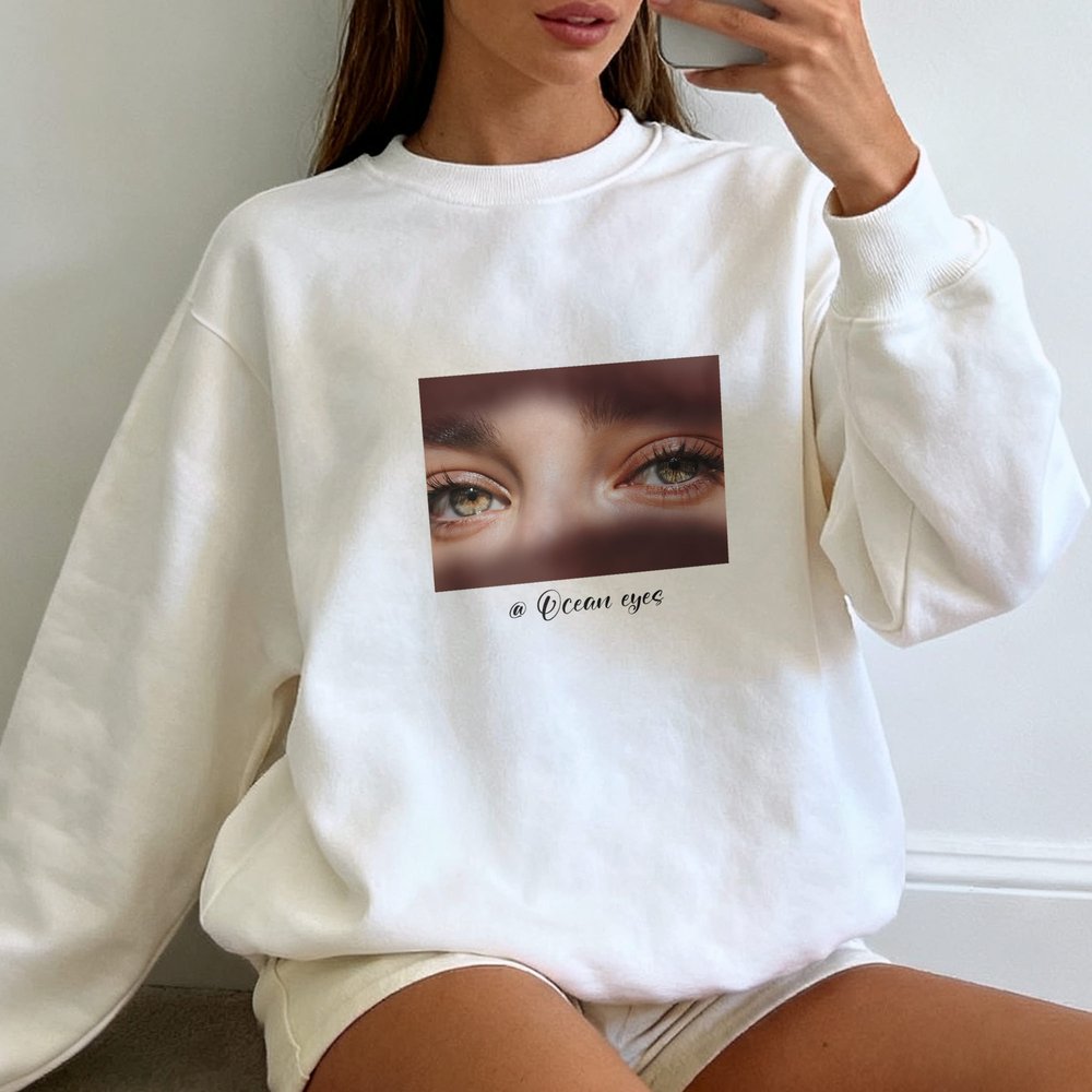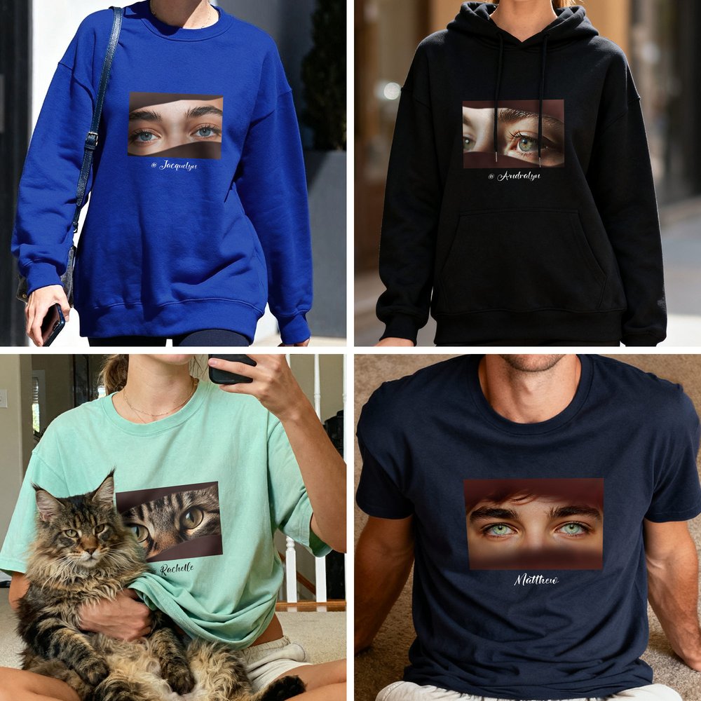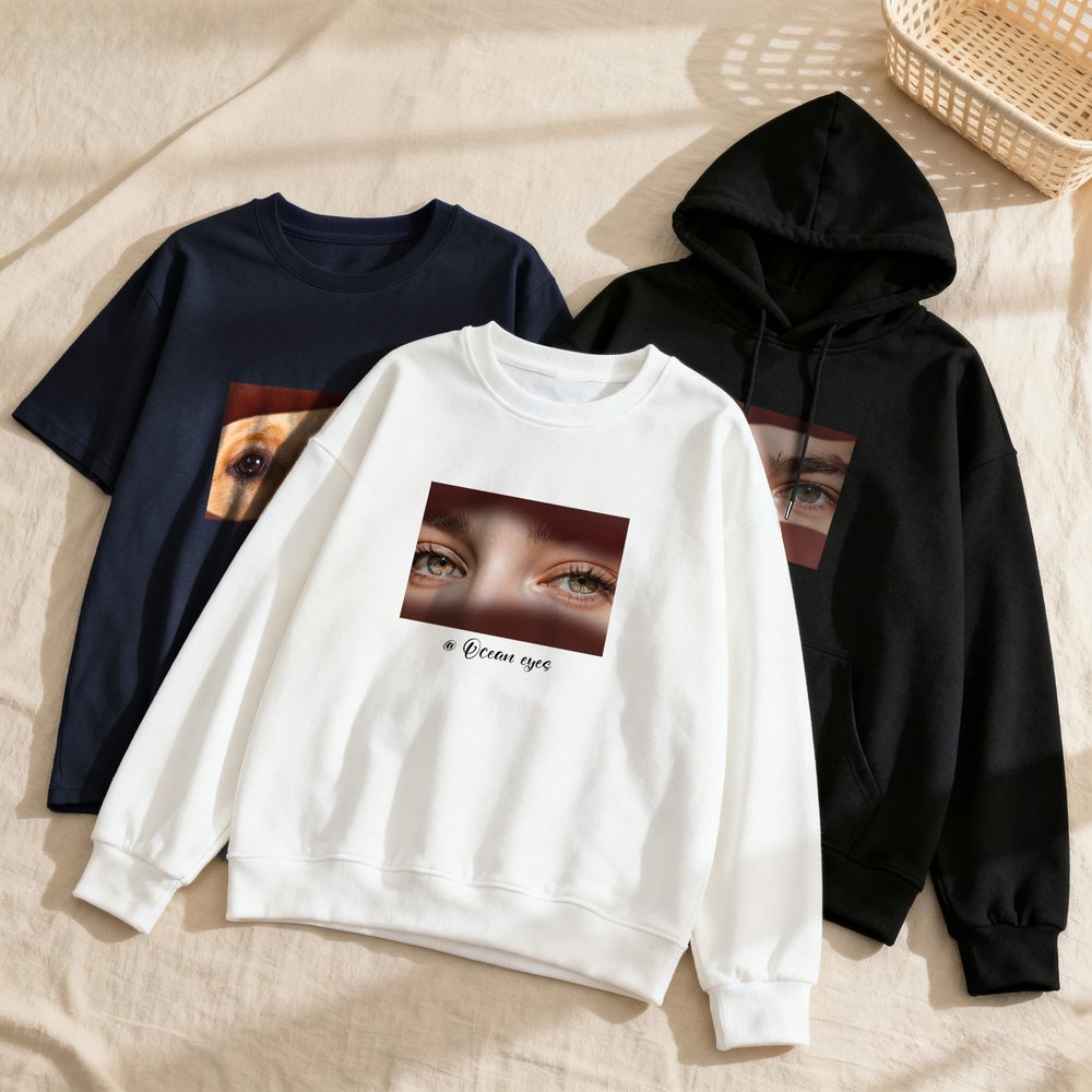 Featuring a photo of an ocean eye and text as the core design, users can upload a photo of their own eyes and add their own name or nickname to the front of the clothes, creating an "eye art" top. This unique yet trendy design sets it apart from ordinary clothes, allowing users to intuitively express their identity and meet the needs of those who seek uniqueness and individual expression, showcasing a confident attitude.