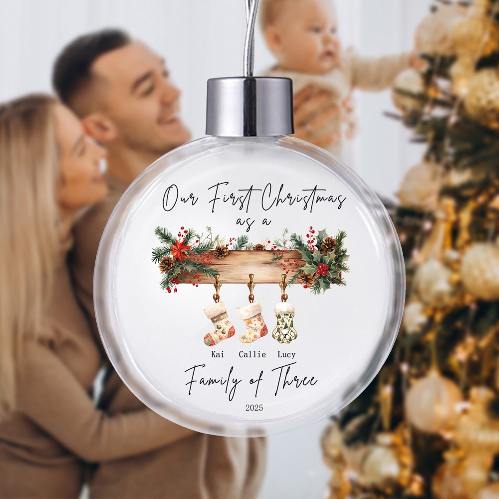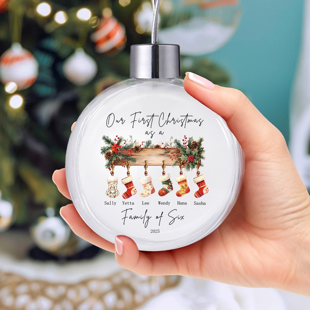 This Christmas ball ornament is designed with our first Christmas in mind, offering 20 different styles of Christmas stockings for you to choose from. You can choose a number of 1-6 stockings and customize the name under each one, perfectly presenting the warm scene of a family reunion, and letting every detail tell the story of home.