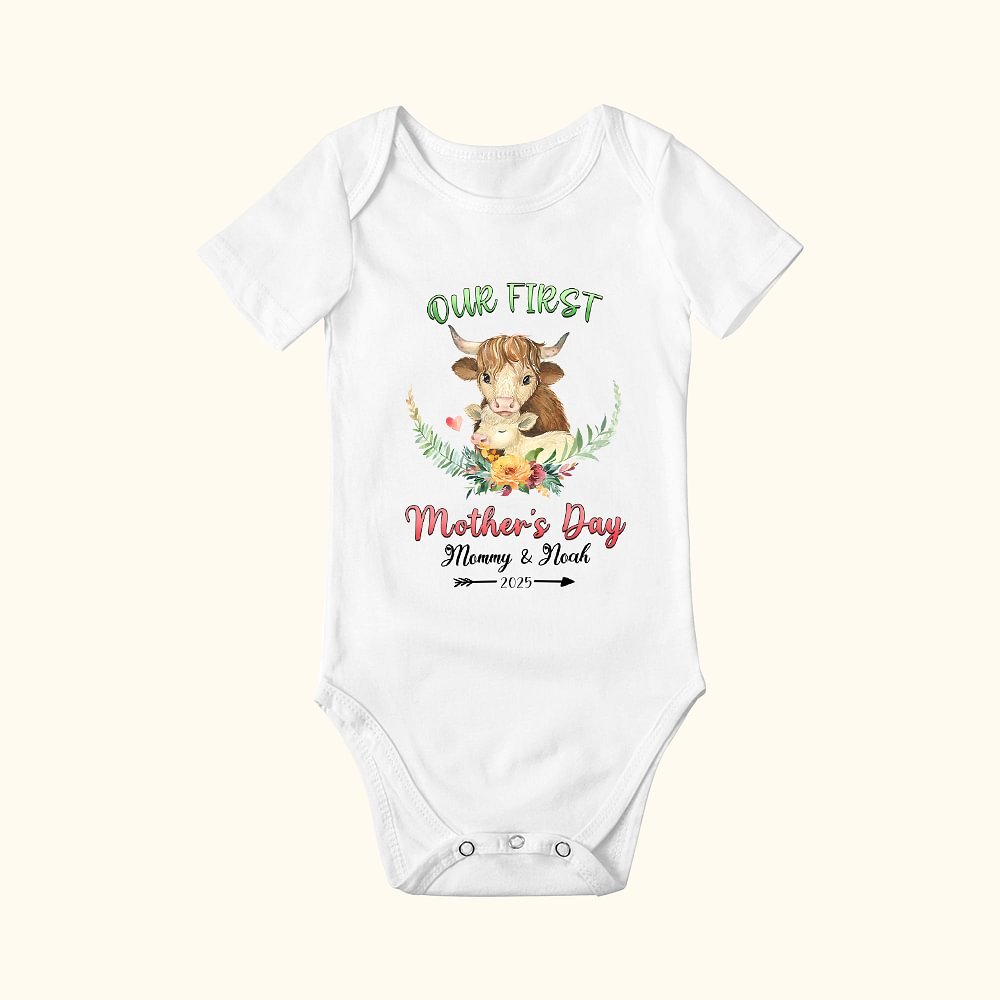 Our baby onesies are designed with cute animals to express the love between mothers and children with the close relationship between elephants, brown bears, giraffes, highland cows, and koalas, and with the celebratory text of "Our First Mother's Day", which makes the festive atmosphere stronger and warmer. We offer the option to add your and your child's name to the front of the onesie, this customization adds a Personalised touch and makes the costume even more meaningful.