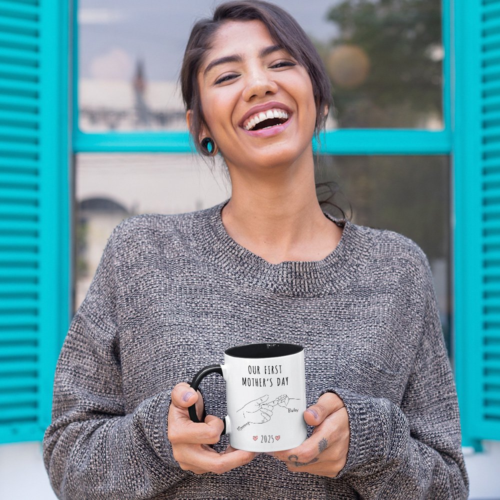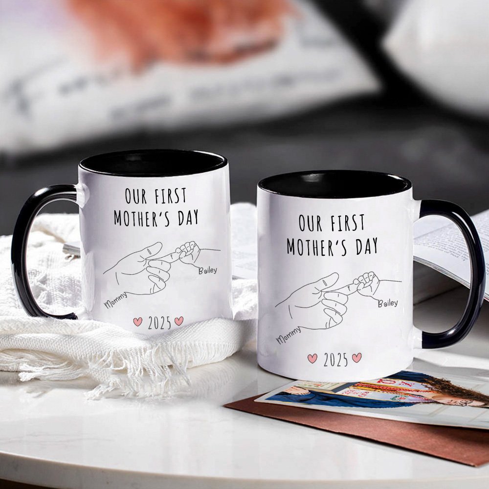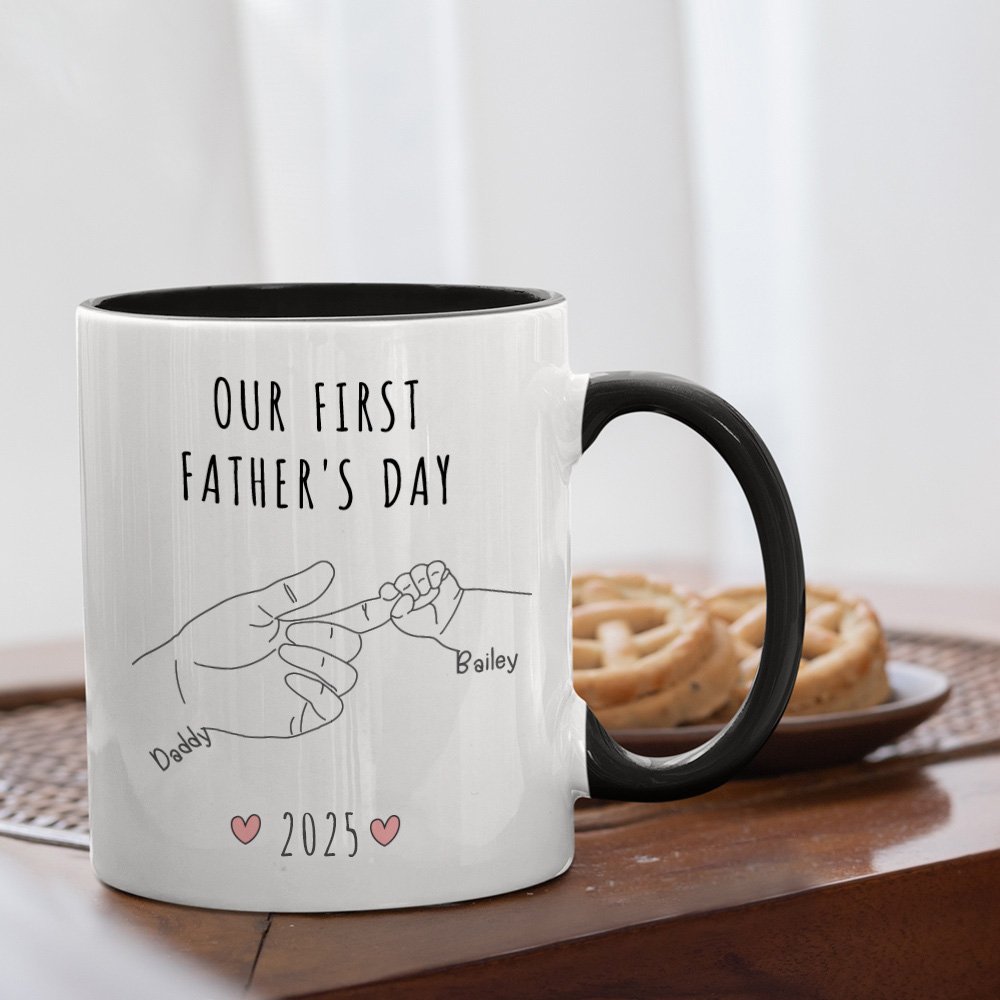This mug is printed with a small hand holding a large hand design and is the perfect embodiment of the emotional bond between the child and parent. The mug also carries the phrase "Our First Mother's Day" or "Our First Father's Day" which is a perfect reminder of that first Mother's Day and Father's Day.