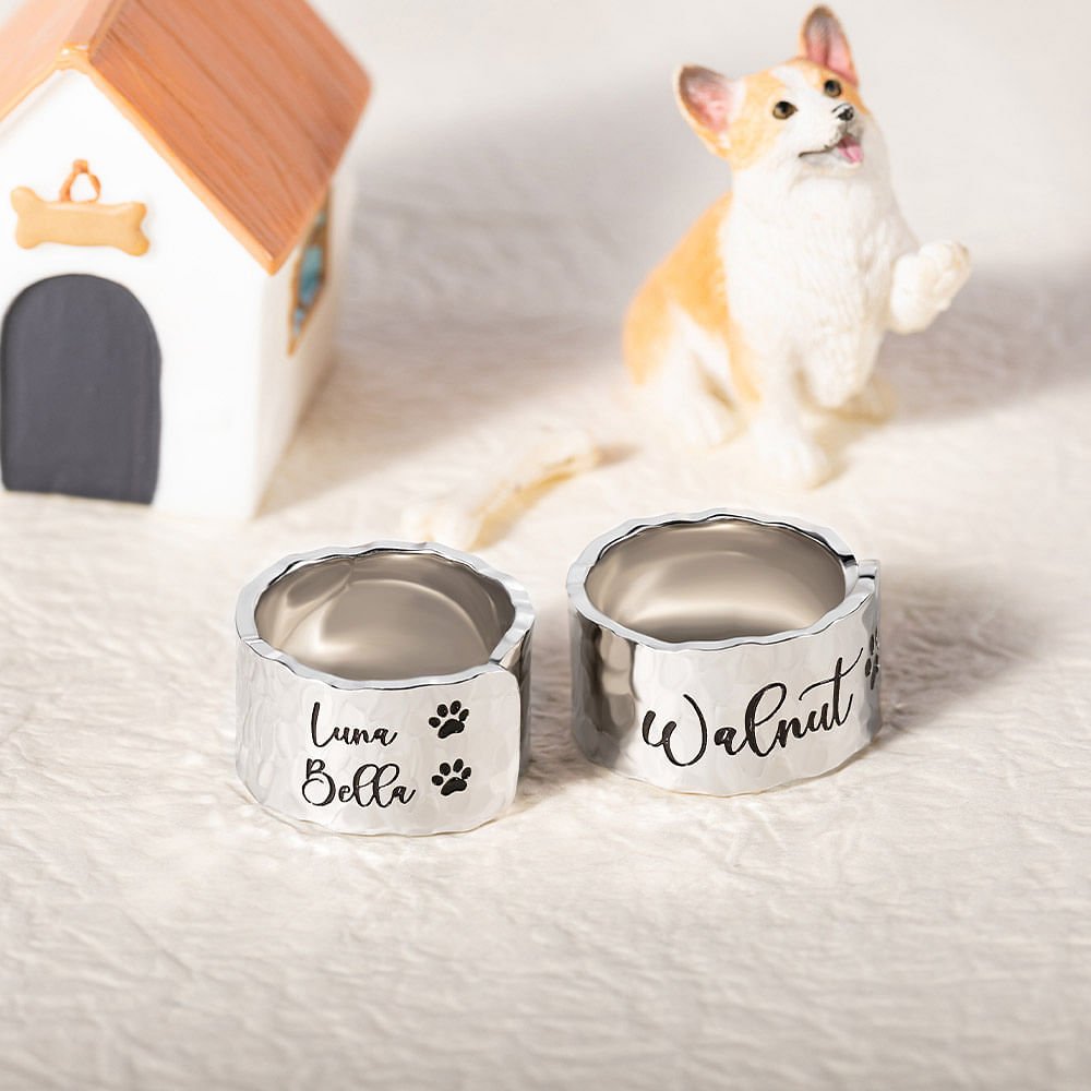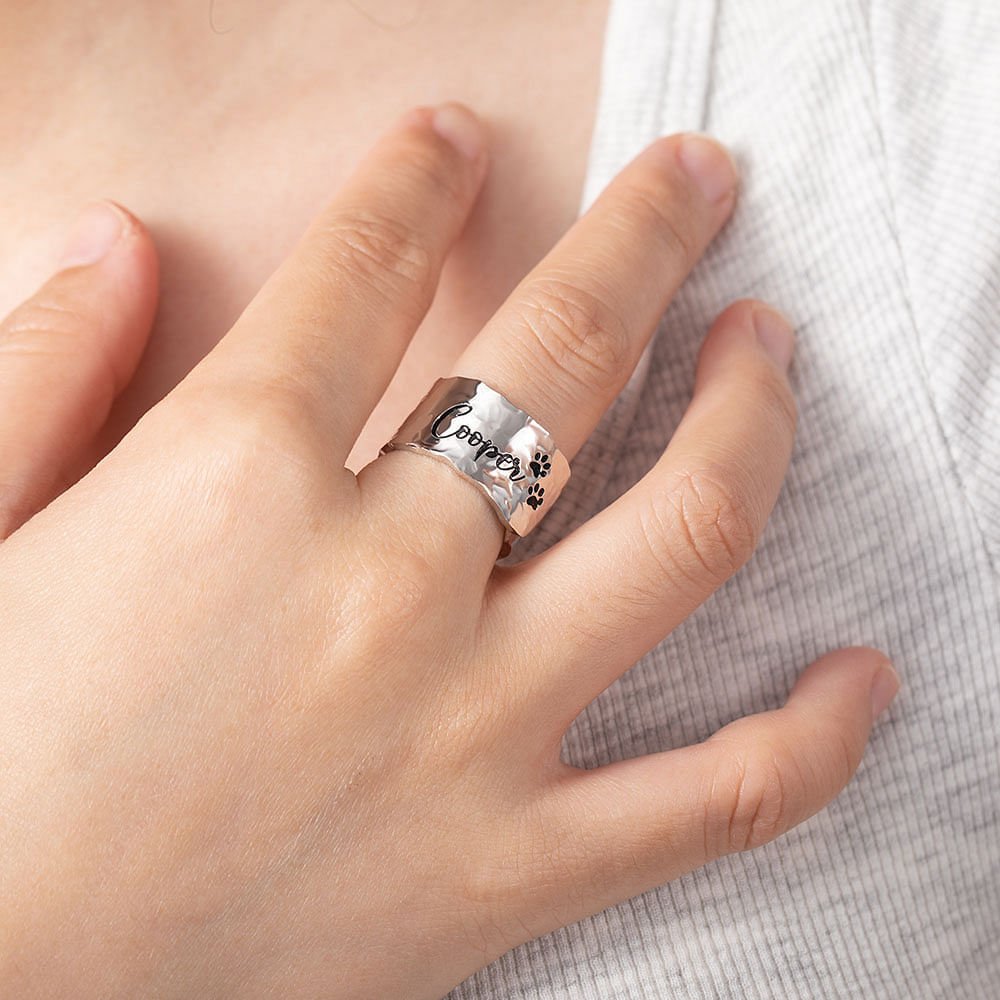 The design of this ring has a wide surface, a customizable name on the front, and a pet paw pattern, which is very cute and personal. The inside of the ring can also be customized to your needs to create a unique piece of text.